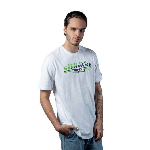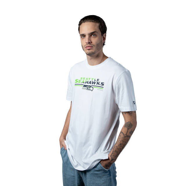 Esta Playera Manga Corta New Era de Seattle Seahawks de la colección NFL 3rd Down 2023 presenta un elegante diseño en color blanco con el logotipo y nombre de los Seahawks en el frente y el flag de New Era bordado en la manga izquierda. Apoya a tu equipo y cómprala ya.