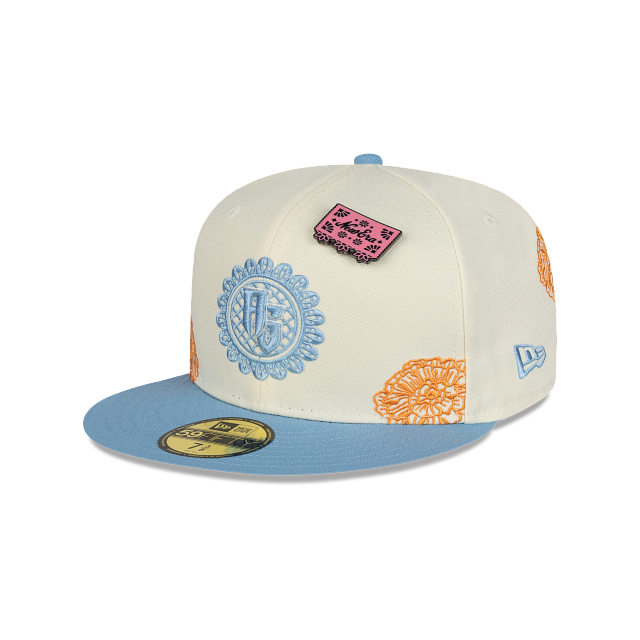 Esta gorra plana New Era 59FIFTY de Algodoneros de Guasave de la colección LAMP Día de Muertos presenta un diseño inspirado en la artesanía del papel picado con el logotipo de los Algodoneros bordado en los paneles frontales, detalles de flores de cempasúchil en la corona, el logo de la LAMP al reverso, un pin en forma de papel picado y el flag de New Era bordado del lado izquierdo. Cómprala ya.