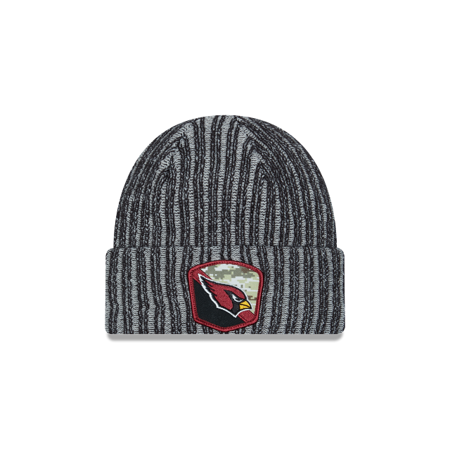 Este Knit New Era de Arizona Cardinals de la colección NFL Salute to Service 2023 presenta un diseño con camuflaje predominantemente negro, el logotipo de los Cardinals bordado al frente, el logo de NFL al reverso, la bandera de Estados Unidos y el flag de New Era a los costados. Apoya a tu equipo y cómpralo ya.