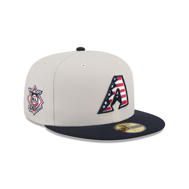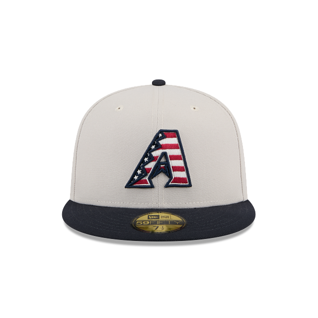 Esta gorra New Era 59FIFTY de Arizona Diamondbacks de la colección MLB 4TH of July presenta una corona blanca con el logotipo de los Diamondbacks con estrellas y líneas de la bandera de Estados Unidos bordado en los paneles frontales, un parche de su conferencia del lado derecho y el MLB Batterman al reverso, y el flag de New Era bordado en el lado izquierdo. Cómprala ya.