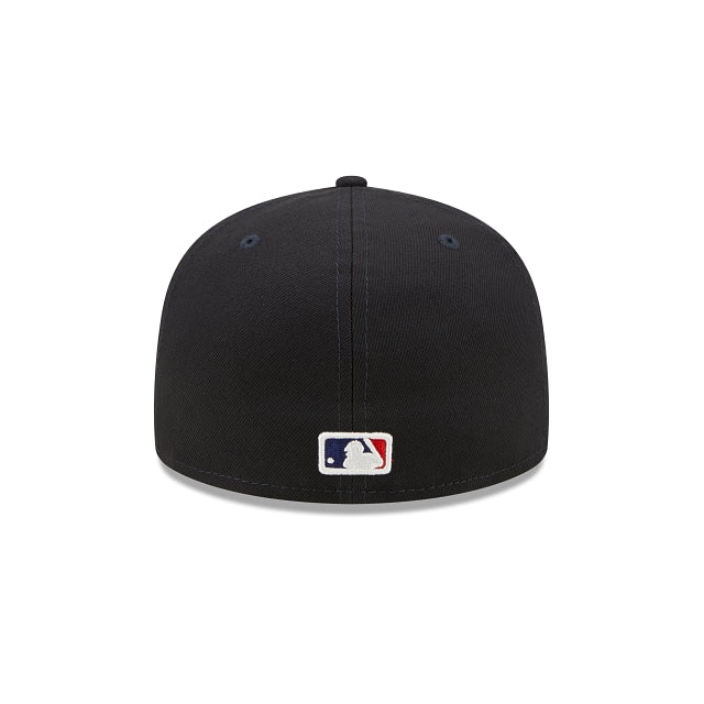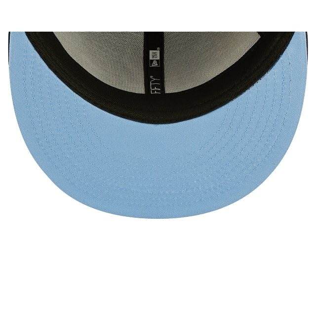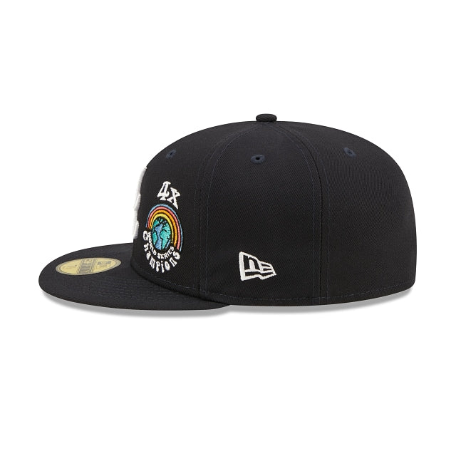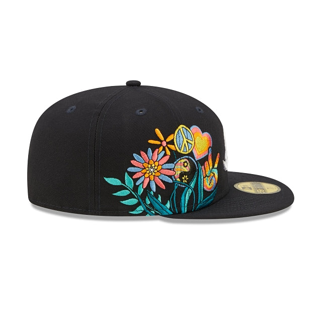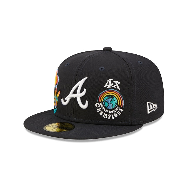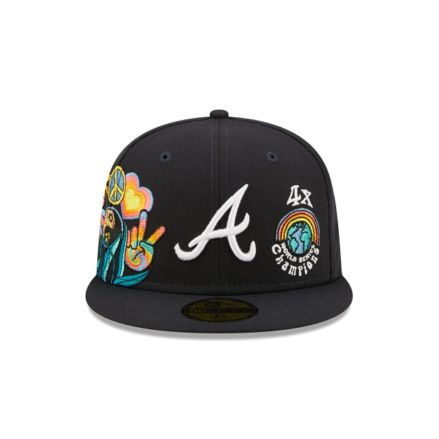 Esta 59FIFTY de Atlanta Braves de la colección Groovy presenta el logotipo de los Braves bordado en los paneles frontales a juego con un parche de World Series Champions y un diseño de peace and love floral en el lado derecho. Detalles adicionales incluyen undervisor azul. Cómprala ya.