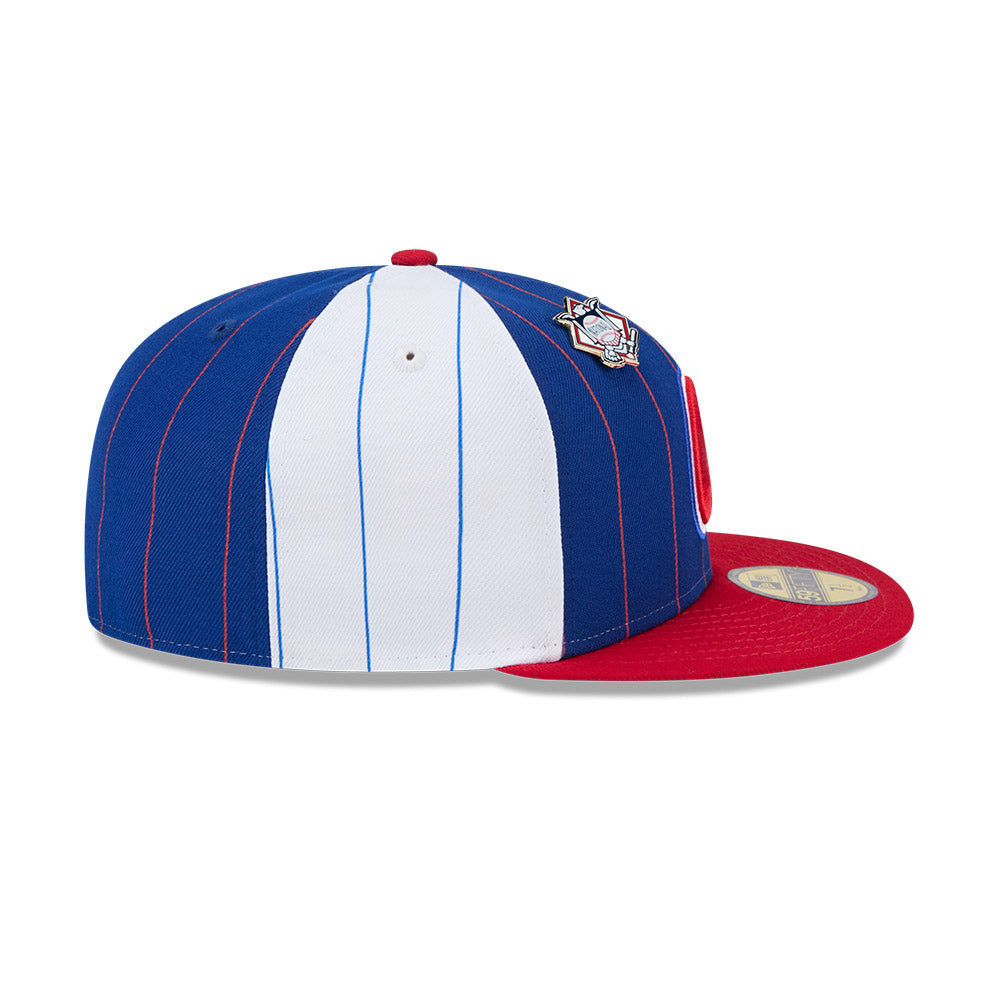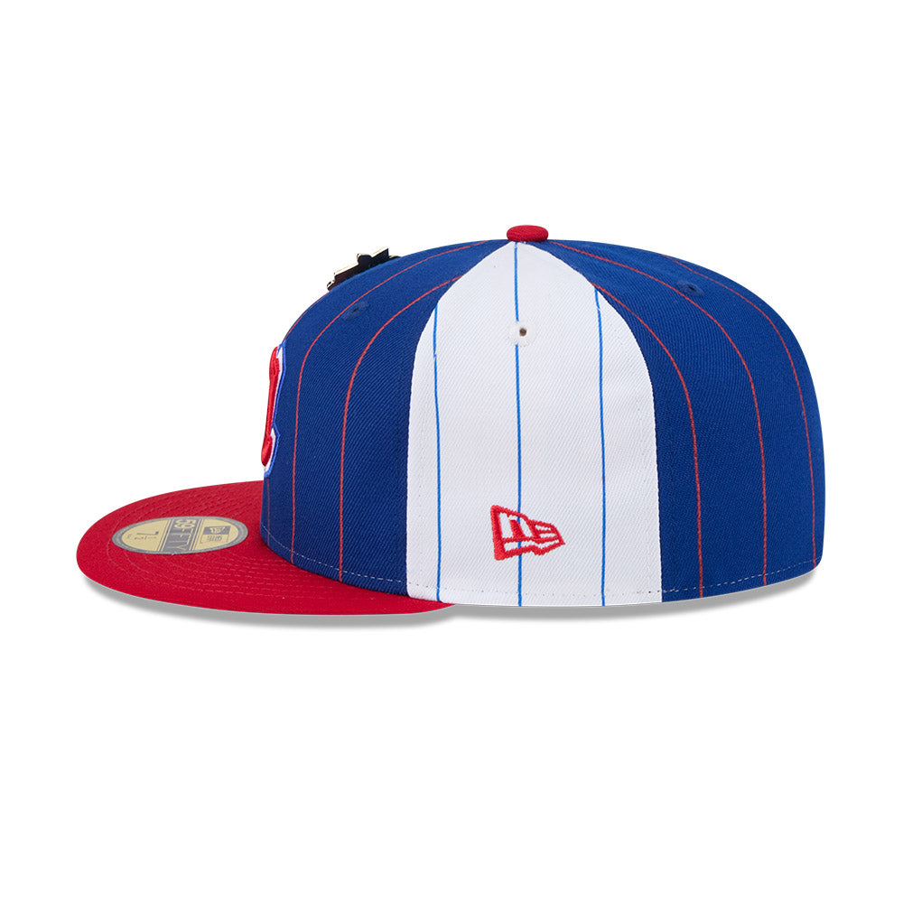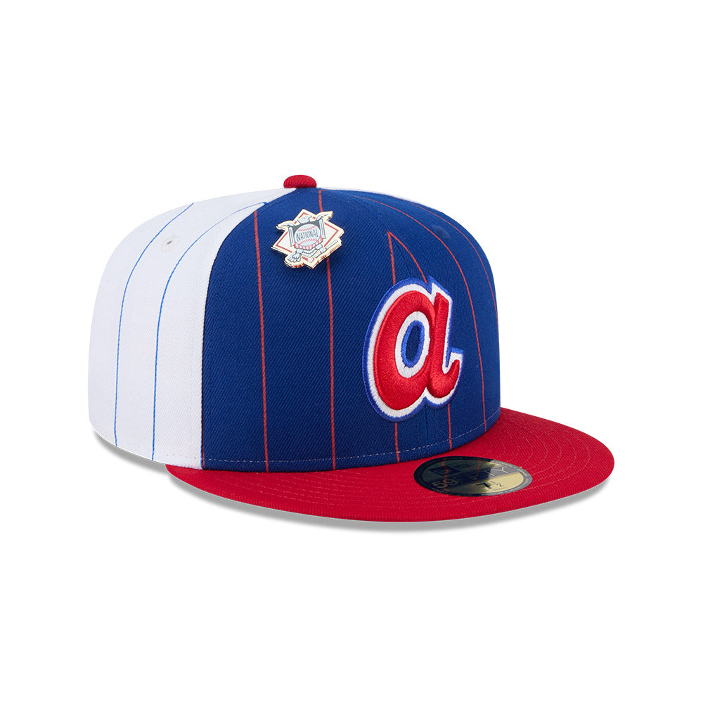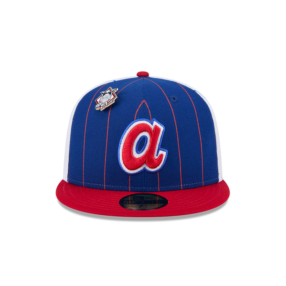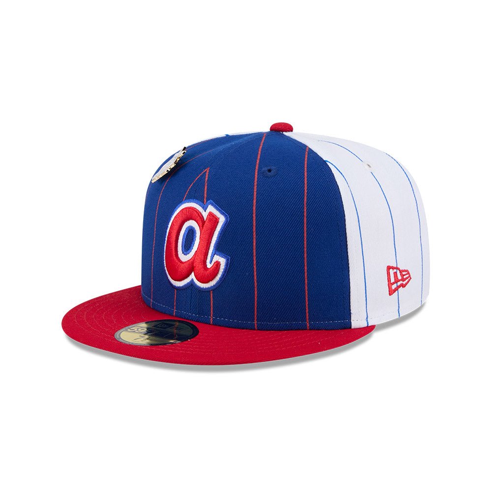 Esta gorra plana New Era 59FIFTY de Atlanta Braves de la colección MLB Pinstripe League Pin presenta un diseño a rayas con el logotipo de los Braves bordado en los paneles frontales acompañado de un pin de la Liga de la MLB a la que pertenecen, el MLB Batterman al reverso y el flag de New Era bordado del lado izquierdo. Cómprala ya.