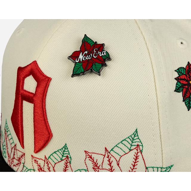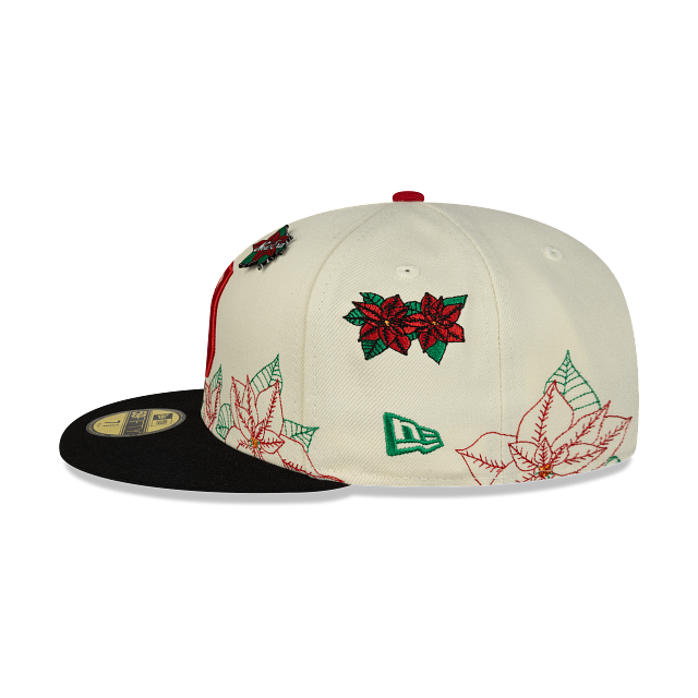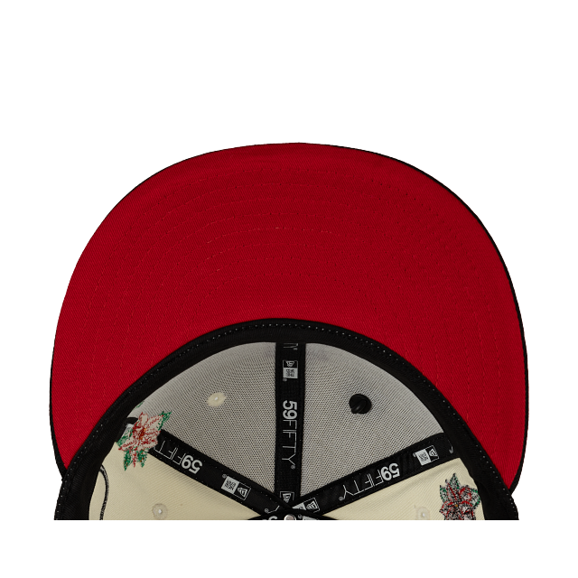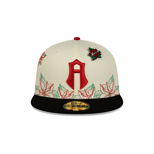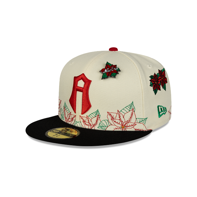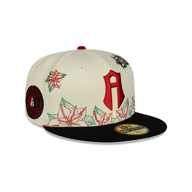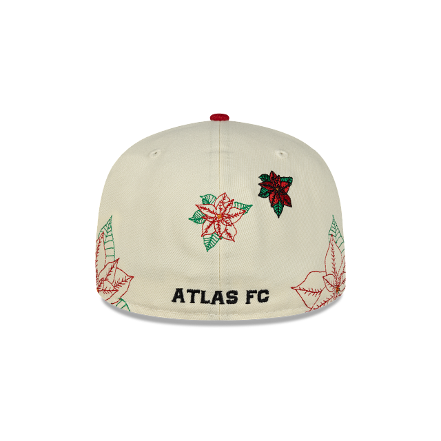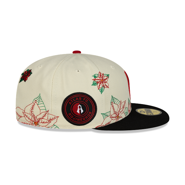 Esta gorra plana New Era 59FIFTY de Atlas FC de la colección Futbol Mexicano Nochebuena presenta un diseño con el logotipo del Atlas bordado en los paneles frontales junto con un pin en forma de flor de nochebuena, hojas de nochebuena en toda la corona, un parche representativo del equipo del lado derecho, el nombre del equipo al reverso y el flag de New Era bordado del lado izquierdo. Cómprala ya.