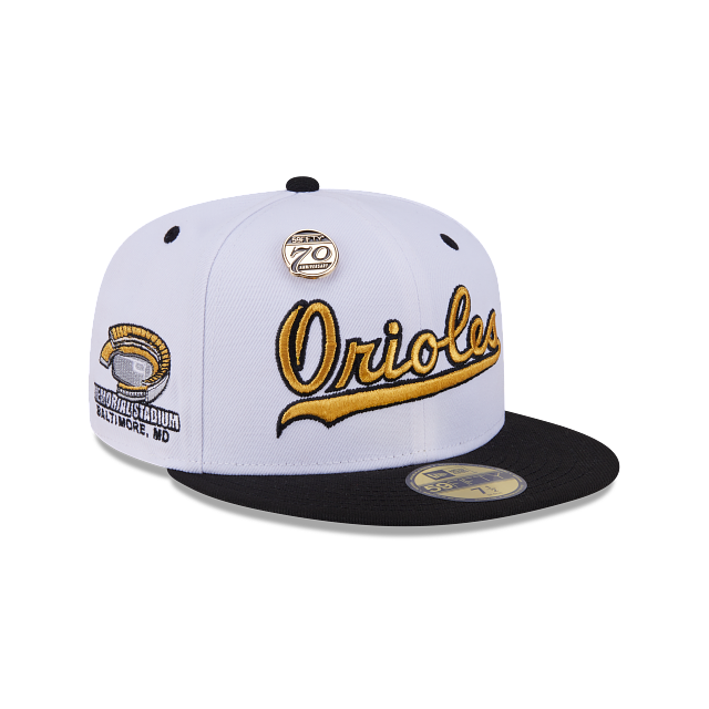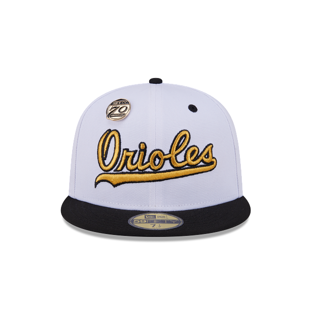Celebra el 70 aniversario de la silueta que cambió el juego con esta gorra New Era 59FIFTY de Baltimore Orioles de la colección del New Era Cap 59FIFTY Day Collection que presenta una corona blanca con el nombre de los Orioles en dorado bordado en los paneles frontales, el pin del 70 aniversario, un parche conmemorativo del lado derecho, el logo de la liga al reverso y el flag de New Era bordado en el lado izquierdo. No te pierdas este artículo de colección y cómprala ya.