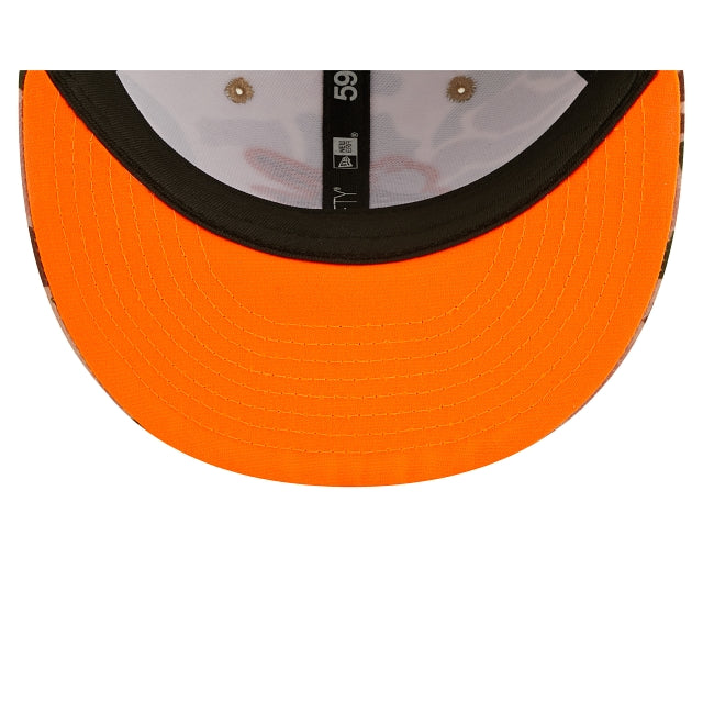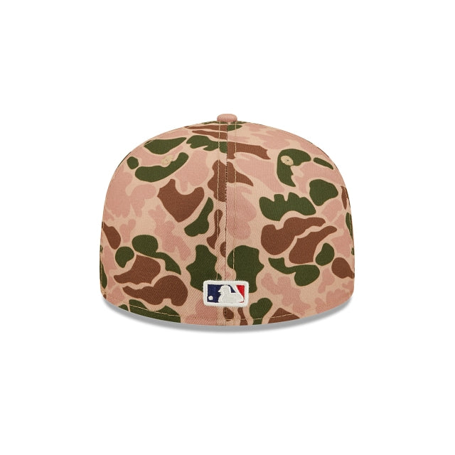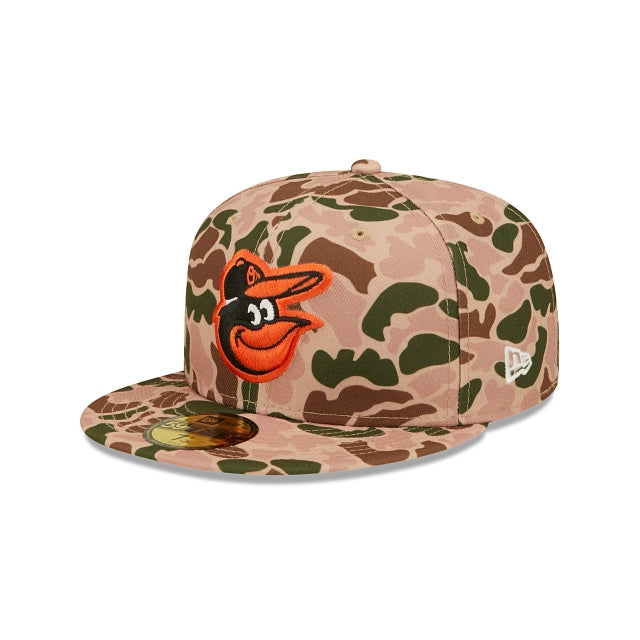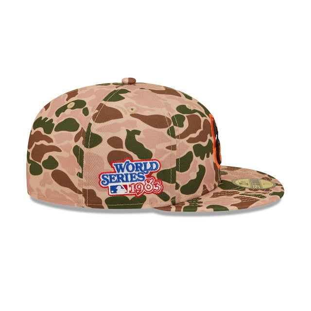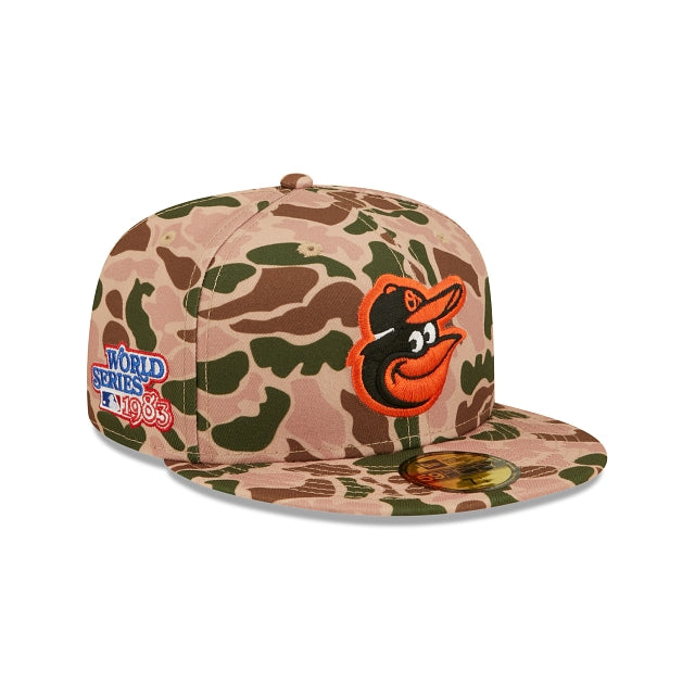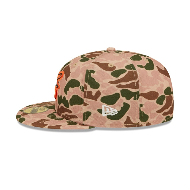 Esta gorra New Era 59FIFTY de Baltimore Orioles MLB Duck Camo presenta una confección de camuflaje de pato con el logotipo de los Orioles bordado en los paneles frontales, un parche lateral de World Series bordado en el lado derecho y el logotipo de MLB Batterman en la parte trasera. Los detalles adicionales incluyen el undervisor rosa. Cómprala ya.