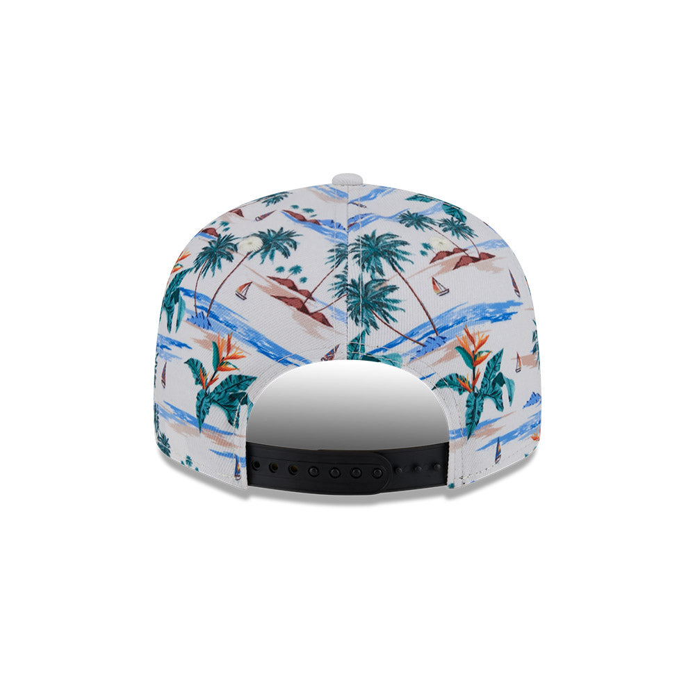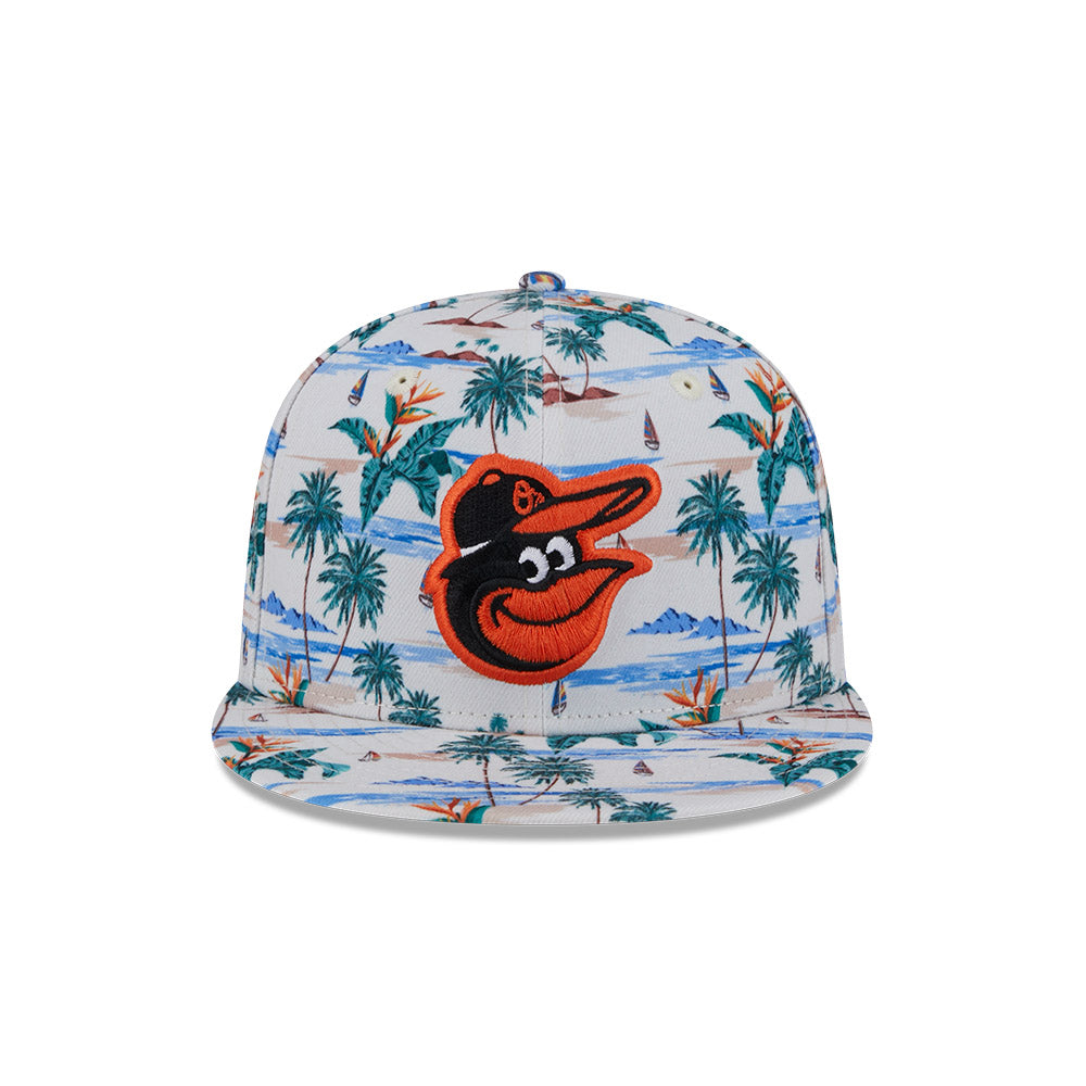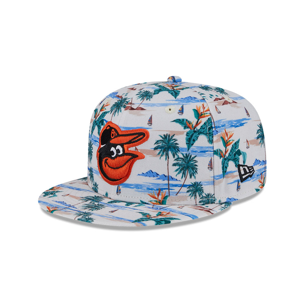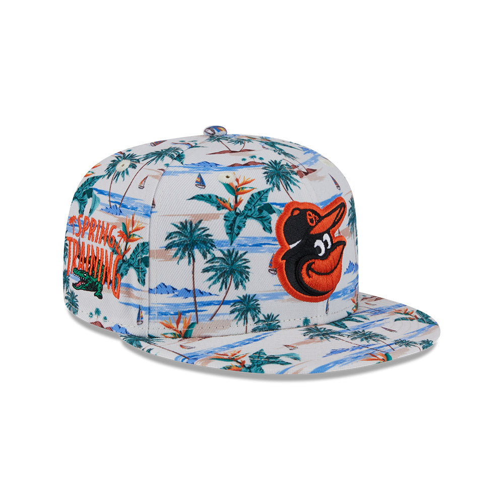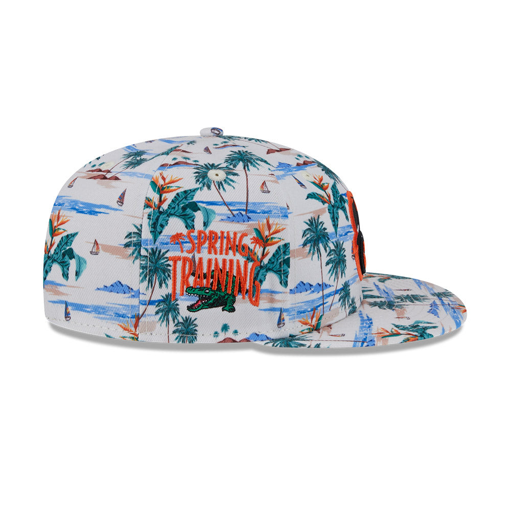 Esta gorra plana New Era 9FIFTY de Baltimore Orioles de la colección MLB Spring Training Fan Pack 2025 presenta un all over print de un paisaje tropical con el logotipo de los Orioles bordado en los paneles frontales, Spring Training bordado del lado derecho y el flag de New Era bordado del lado izquierdo. Cómprala ya.