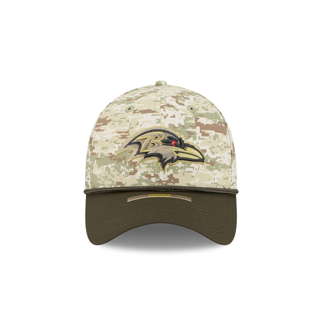 Esta gorra curva New Era 39THIRTY de Baltimore Ravens de la colección NFL Salute to Service 2025 presenta un diseño de camuflaje con el logotipo de los Ravens bordado en los paneles frontales, la bandera de Estados Unidos del lado derecho, el logo de la NFL en la parte de atrás, el logo del equipo en el undervisor y el flag de New Era bordado del lado izquierdo. Cómprala ya.