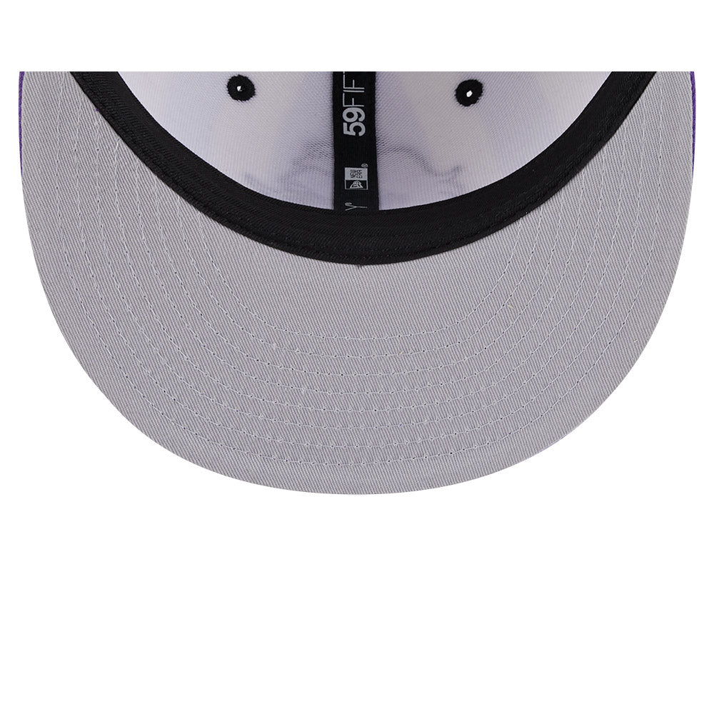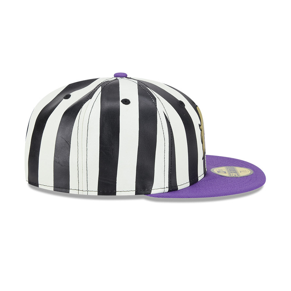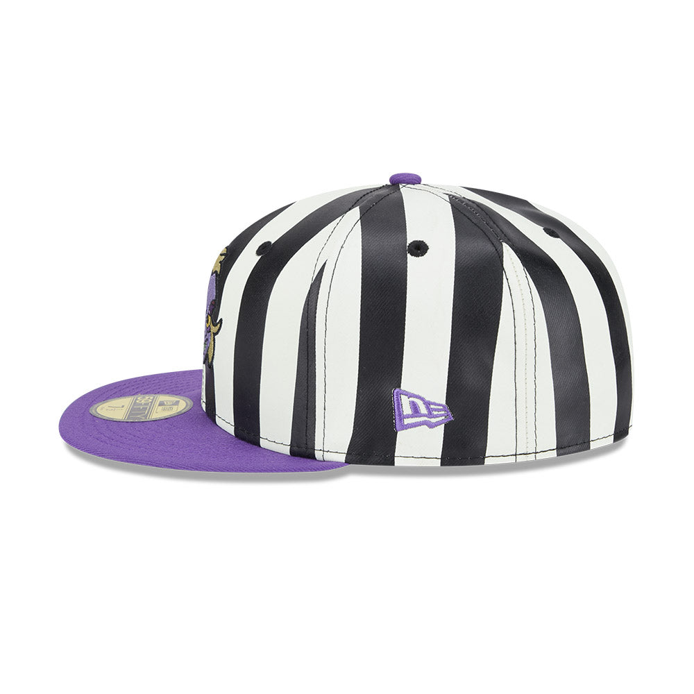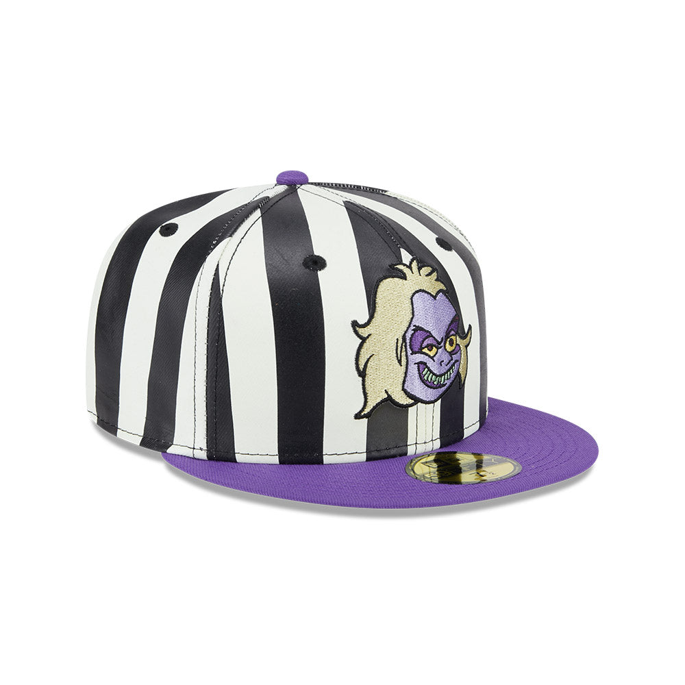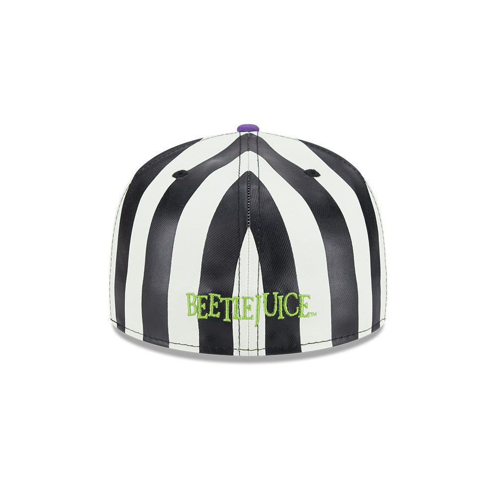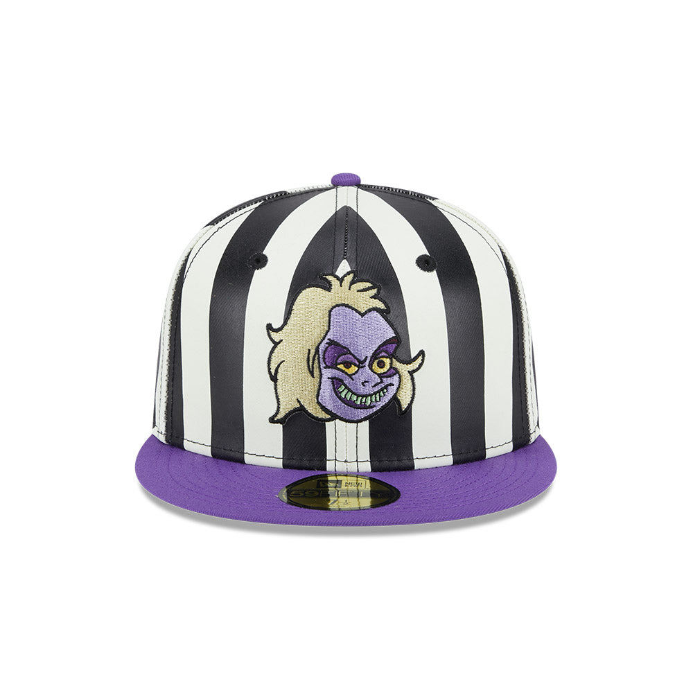 Esta gorra plana New Era 59FIFTY de la colección Beetlejuice presenta un diseño inspirado en la película Beetlejuice con la imagen del personaje bordado en los paneles frontales, el nombre de la película al reverso y el flag de New Era bordado del lado izquierdo. No necesitas decir Beetlejuice tres veces, cómprala ya.