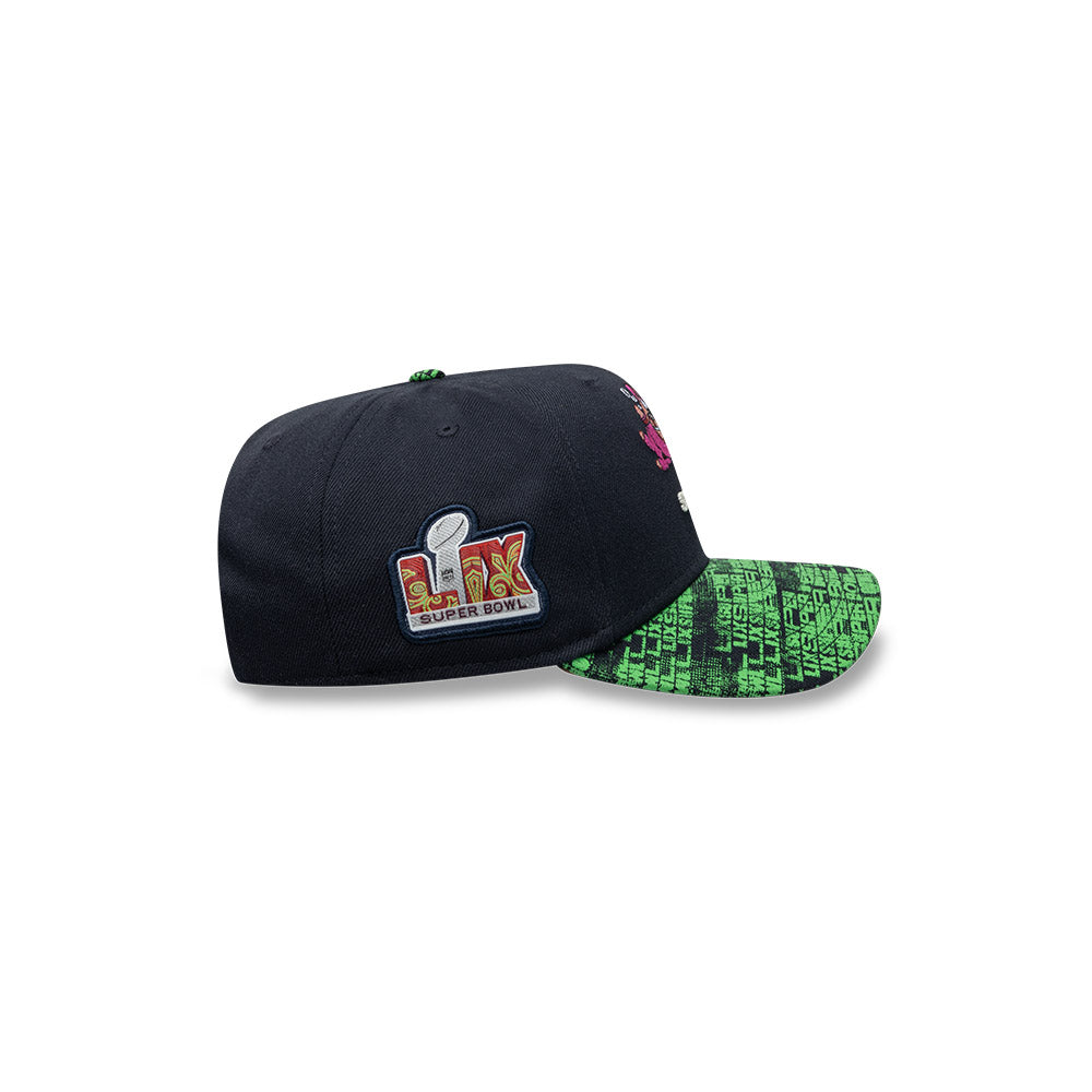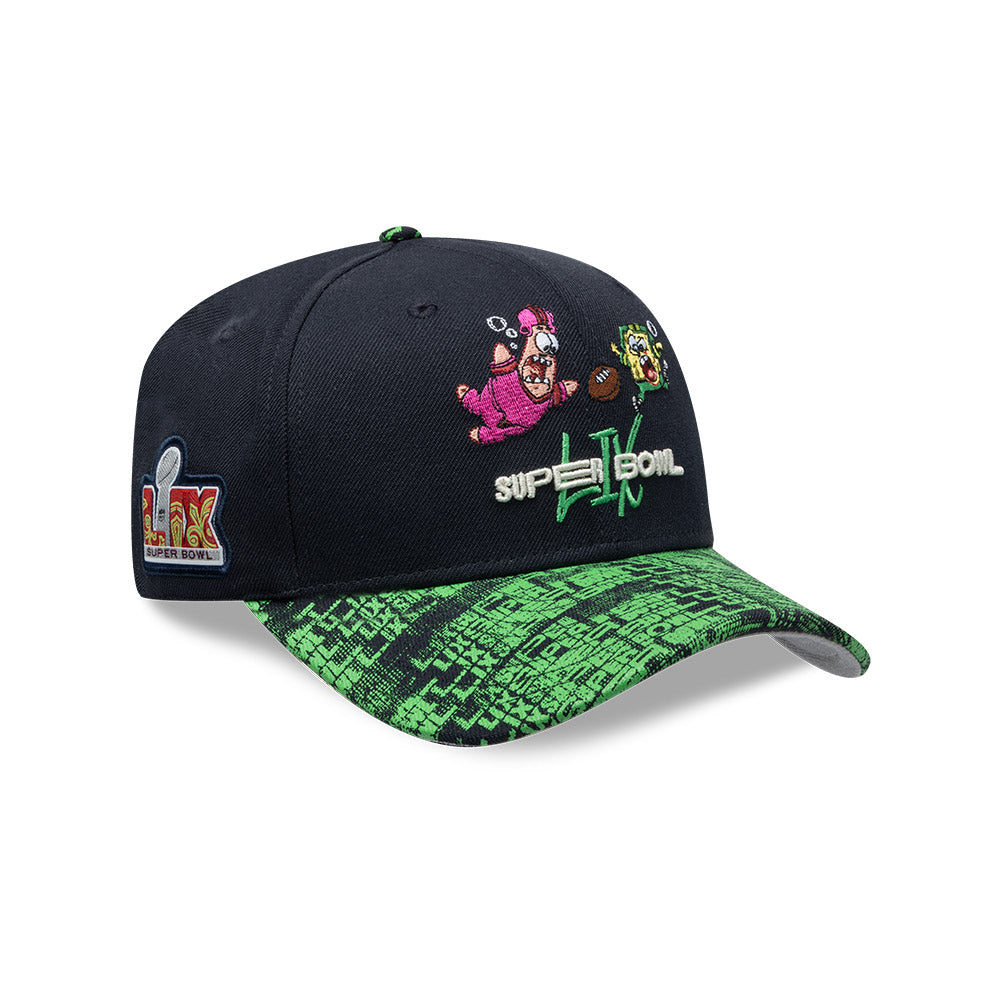 Esta gorra curva New Era 9SEVENTY presenta un diseño 2-Tone con el nombre del Super Bowl LIX debajo de Bob Esponja y Patricio Estrella caracterizados de jugadores de futbol americano bordados en los paneles frontales, el visor estampado con el nombre y edición de este evento, el logo del Super Bowl LIX del lado derecho, el logo de la NFL al reverso y el flag de New Era bordado del lado izquierdo.