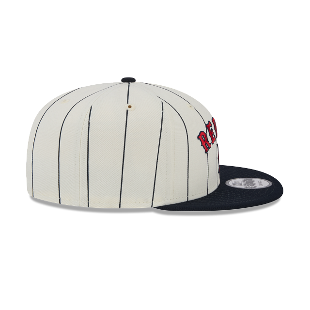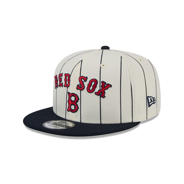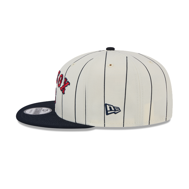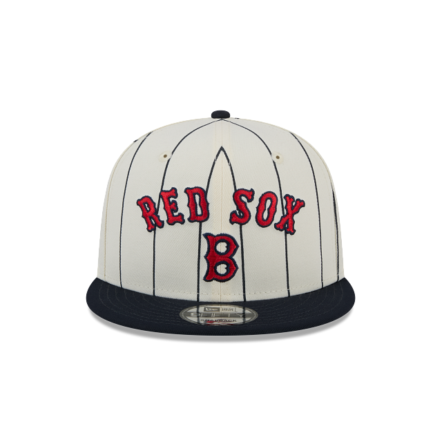 Esta gorra New Era 9FIFTY de Boston Red Sox de la colección exclusiva de la tienda en línea MLB Jersey Pinstripe presenta un diseño blanco con líneas verticales estilo jersey pinstripe con el logotipo retro y el nombre de los Red Sox bordado en los paneles frontales, undervisor verde y el flag de New Era bordado en el lado izquierdo. Luce con estilo y cómprala ya.
