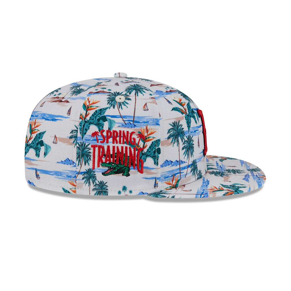 Esta gorra plana New Era 9FIFTY de Boston Red Sox de la colección MLB Spring Training Fan Pack 2025 presenta un all over print de un paisaje tropical con el logotipo de los Red Sox bordado en los paneles frontales, Spring Training bordado del lado derecho y el flag de New Era bordado del lado izquierdo. Cómprala ya.