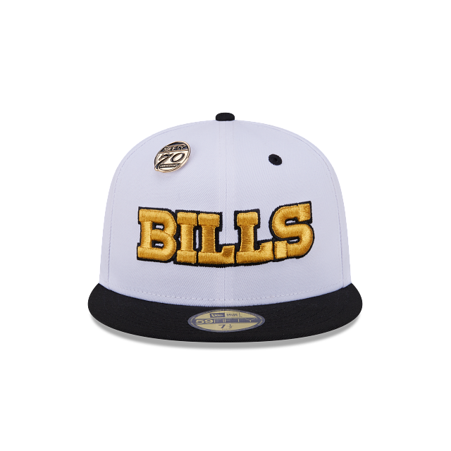 Celebra el 70 aniversario de la silueta que cambió el juego con esta gorra New Era 59FIFTY de Buffalo Bills de la colección del New Era Cap 59FIFTY Day Collection que presenta una corona blanca con el nombre de los Bills en dorado bordado en los paneles frontales, el pin del 70 aniversario, un parche conmemorativo del lado derecho, el logo de la liga al reverso y el flag de New Era bordado en el lado izquierdo. No te pierdas este artículo de colección y cómprala ya.