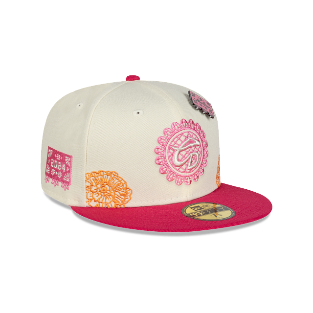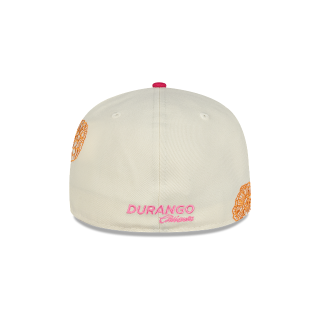 Esta gorra plana New Era 59FIFTY de Caliente de Durango de la colección LMB Día de Muertos presenta un diseño inspirado en la artesanía del papel picado con el logotipo de los Caliente bordado en los paneles frontales, detalles de flores de cempasúchil en la corona, el nombre del equipo al reverso, un pin en forma de papel picado y el flag de New Era bordado del lado izquierdo. Cómprala ya.