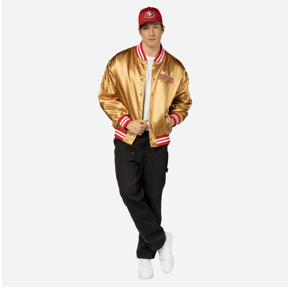 Esta Chamarra Bomber New Era de San Francisco 49Ers de la colección NFL Graphics presenta un diseño satinado con el nombre de los 49Ers en la parte frontal izquierda, el logo del equipo al reverso, el logo de la NFL en la manga derecha, su Conferencia y el flag de New Era bordado en la manga izquierda. Completa tu outfit y cómprala ya.