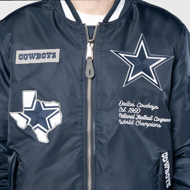 Esta Chamarra New Era de Dallas Cowboys de la colección Alpha Industries X NFL presenta el logo de los Cowboys en la parte frontal izquierda, parches representativos del equipo del lado derecho, un bolsillo con una cinta de Alpha Industries y el flag de New Era bordado en la manga izquierda. Cómprala ya.