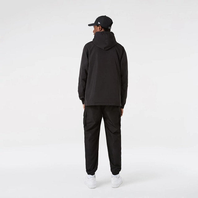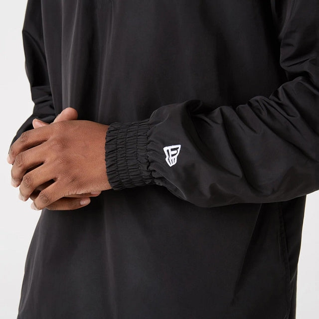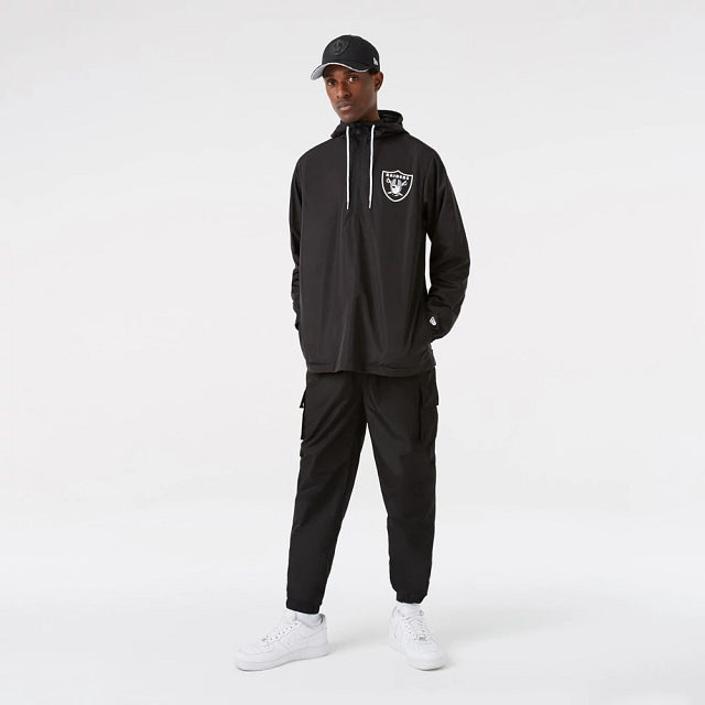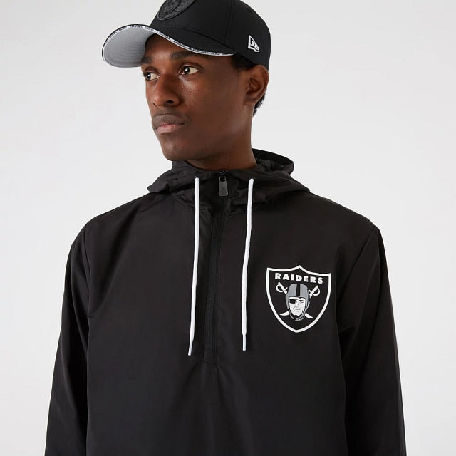 Esta Chamarra de Las Vegas Raiders tipo rompevientos con hoodie presenta el logo del equipo en el pecho del lado izquierdo en negro y un detalle de color que contrasta sobre negro y los cordones del hoodie también en el color del equipo.