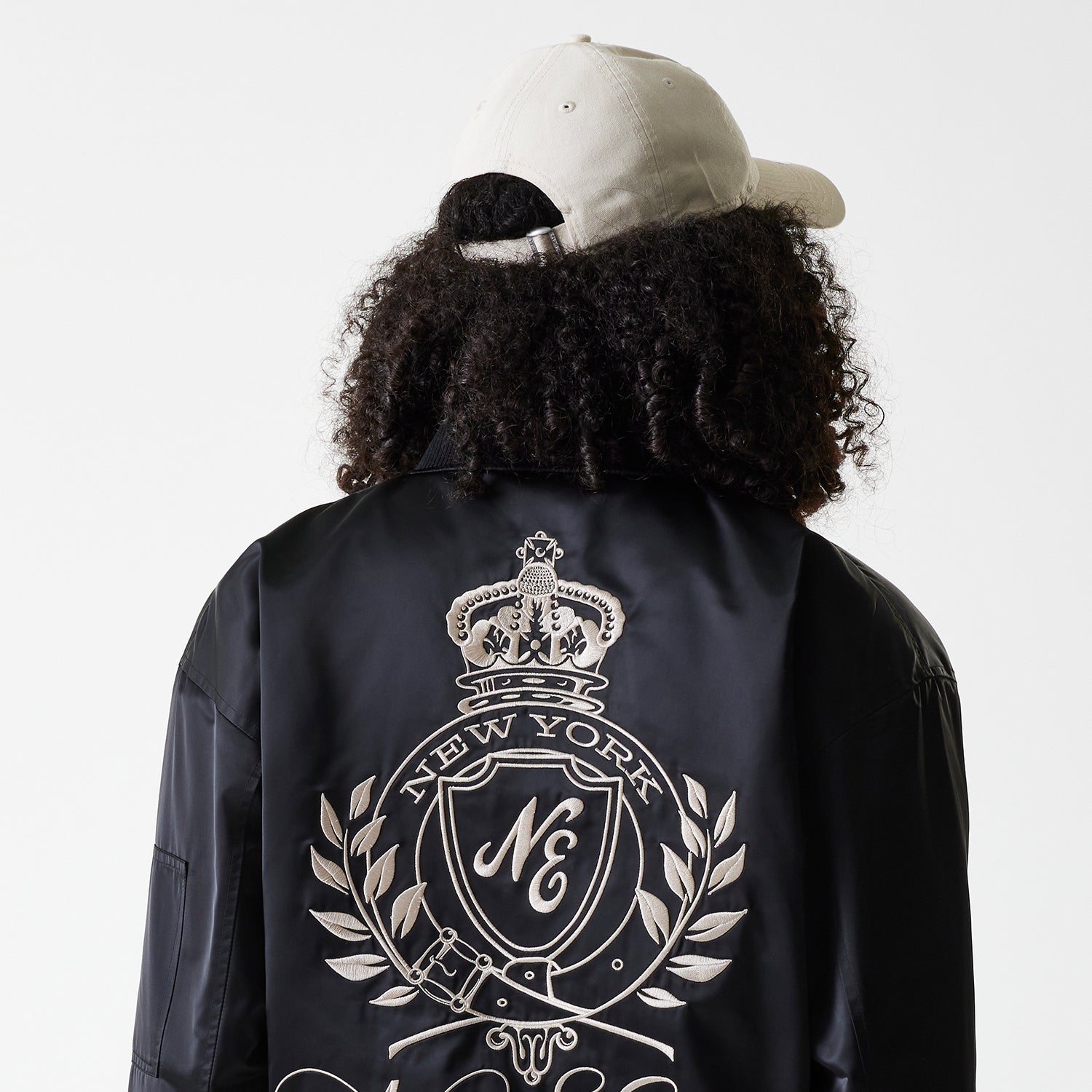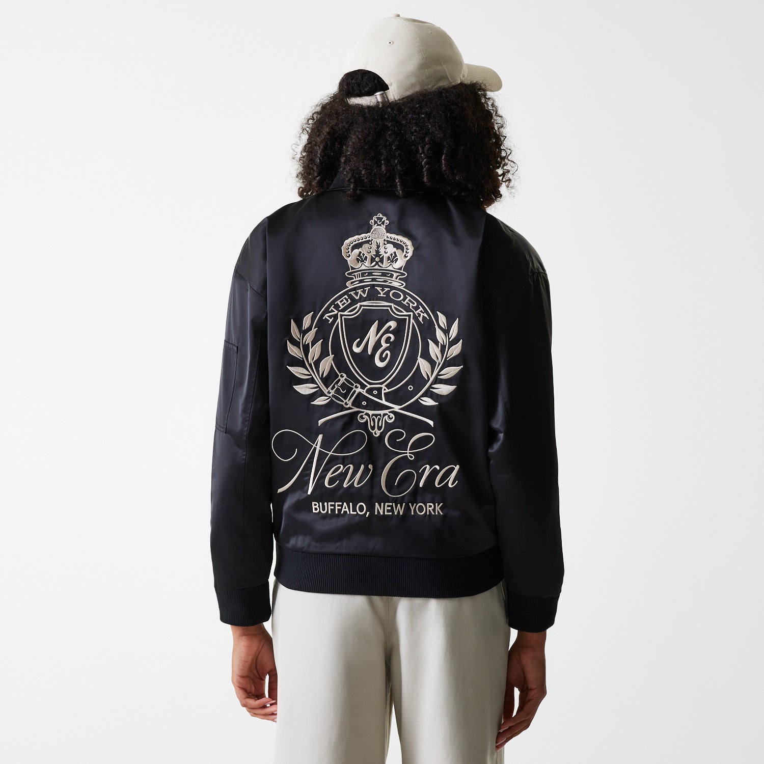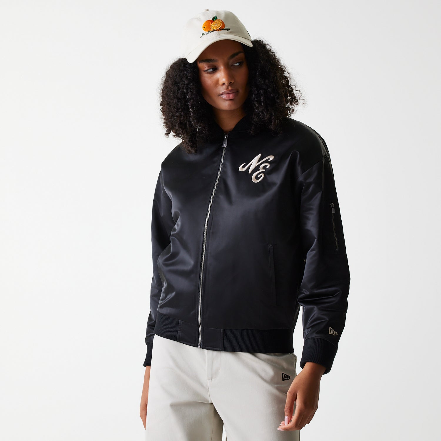 Esta Chamarra tipo Bomber New Era para Mujer de la colección New Era Heritage presenta un diseño satinado en color negro con el logo New Era Heritage Connect en la parte frontal izquierda, logo New Era Crest en la parte de atrás, bolsillo interior y el flag de New Era bordado en la manga izquierda. Cómprala ya.