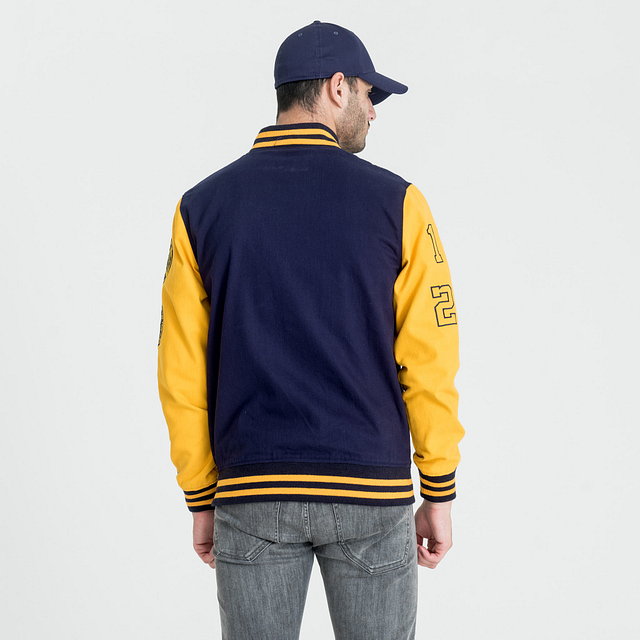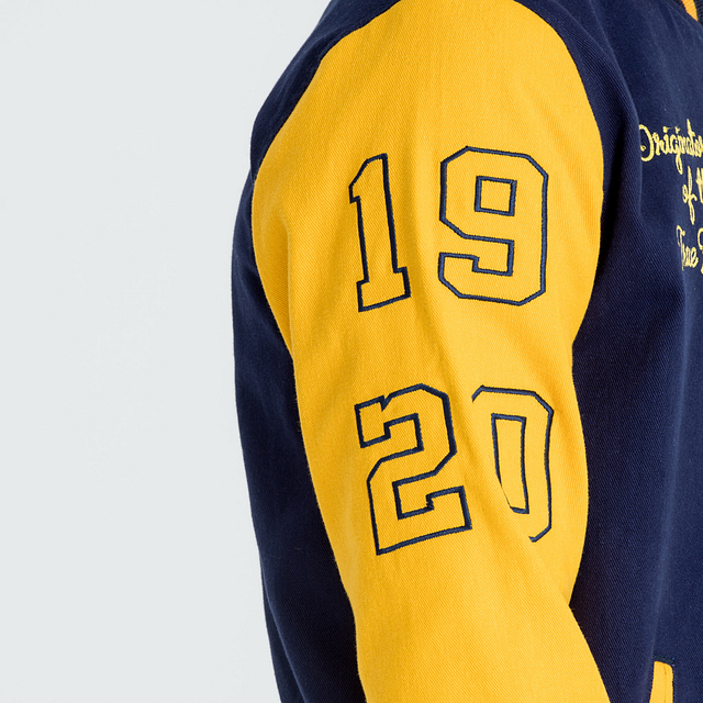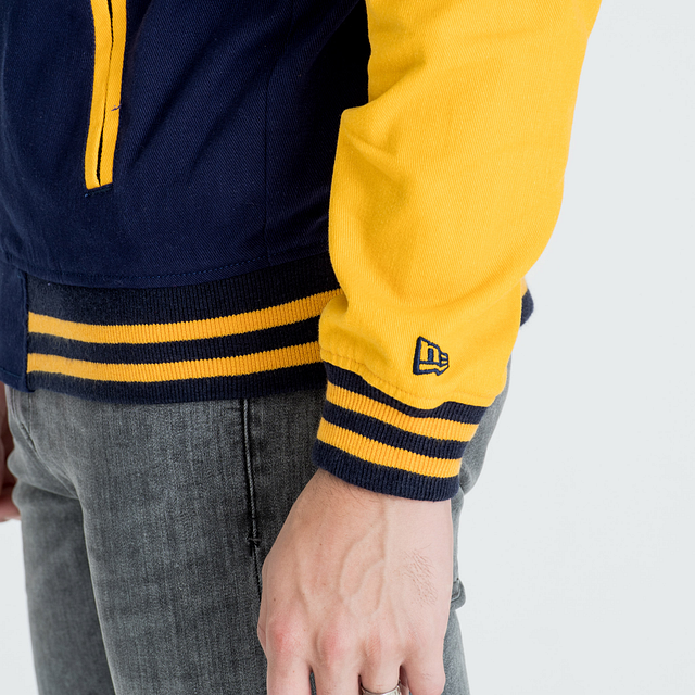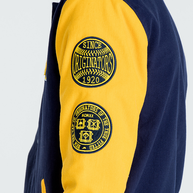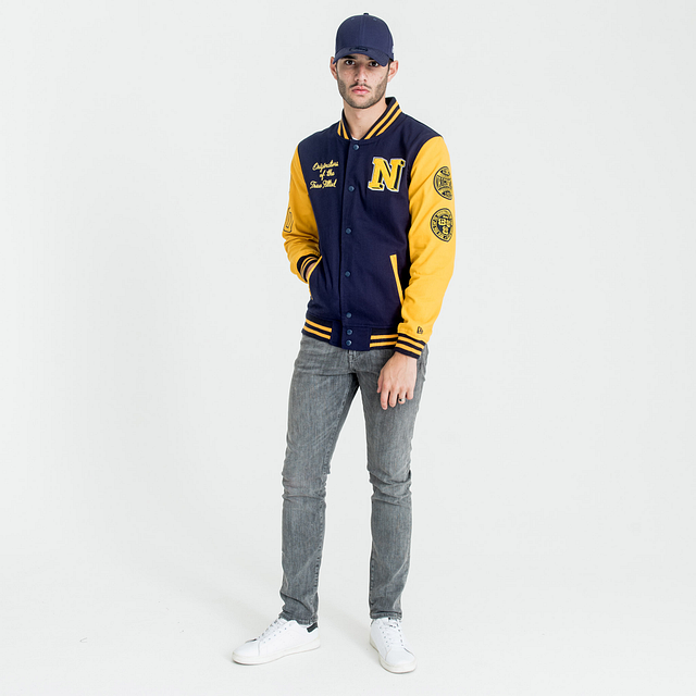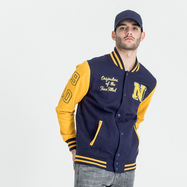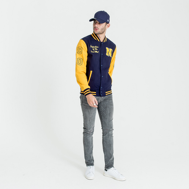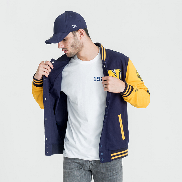 Esta Chamarra New Era de la colección New Era Originators presenta un diseño tipo universitario en color azul con las mangas amarillas con parches de New Era Branded, una N en grande en el pecho y el lema Originators of the True Fitted, y el flag New Era en la manga izquierda. Luce con estilo y cómprala ya.