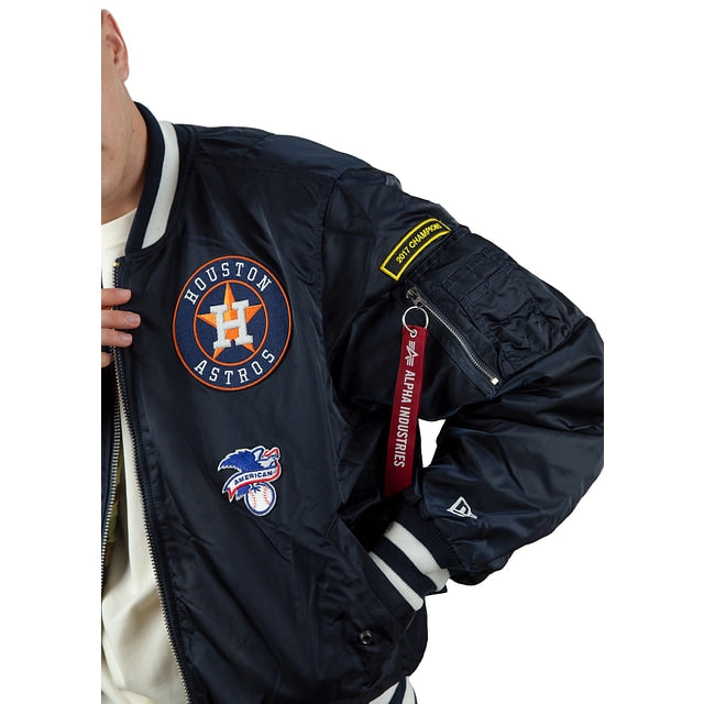 Esta MA-1 Bomber Jacket Alpha Industries X Houston Astros presenta parches de los Astros bordados en el pecho y en las mangas con un logo del equipo en la parte trasera. El lado reversible de la chamarra presenta un diseño en camuflaje militar y una etiqueta de New Era con un mensaje de unión en diferentes idiomas. Cómprala ya.