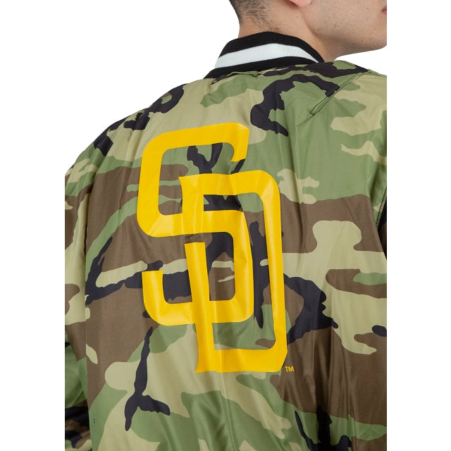 Esta MA-1 Bomber Jacket Alpha Industries X San Diego Padres de la colección Alpha x New Era x MLB presenta parches de los Padres bordados en el pecho y en las mangas con un logo del equipo en la parte trasera. El lado reversible de la chamarra presenta un diseño en camuflaje militar y una etiqueta de New Era con un mensaje de unión en diferentes idiomas. Cómprala ya.
