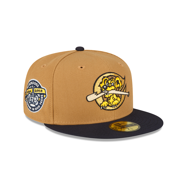 Esta gorra New Era 59FIFTY de Charleston River Dogs de la colección MiLB Vegas Gold en color café presenta el logo de los Dogs bordado en los paneles frontales, la silueta plana presenta la visera en color azul y el undervisor en color verde, el Batterman en la parte trasera. Cómprala ya.