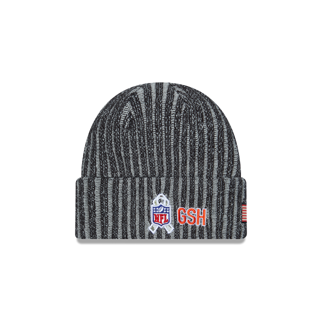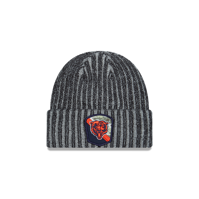 Este Knit New Era de Chicago Bears de la colección NFL Salute to Service 2023 presenta un diseño con camuflaje predominantemente negro, el logotipo de los Bears bordado al frente, el logo de NFL al reverso, la bandera de Estados Unidos y el flag de New Era a los costados. Apoya a tu equipo y cómpralo ya.