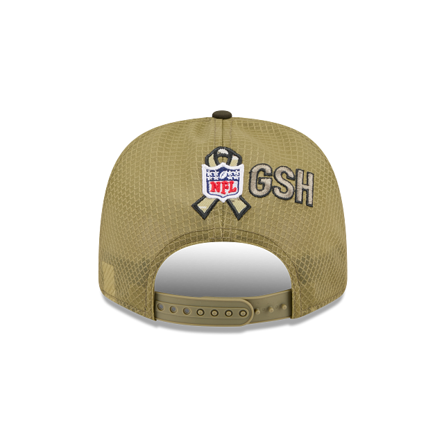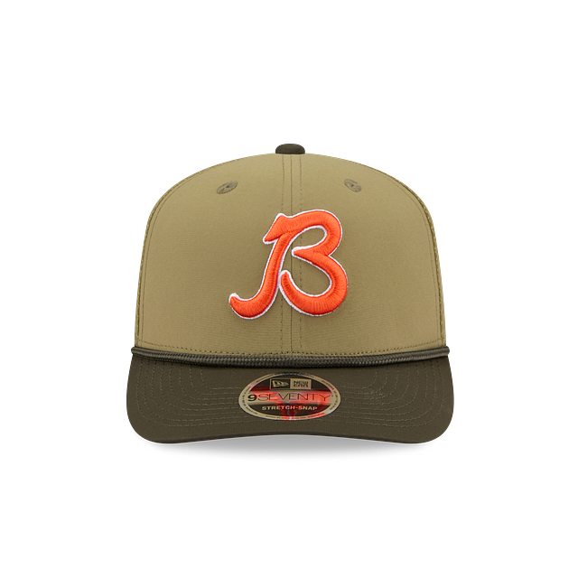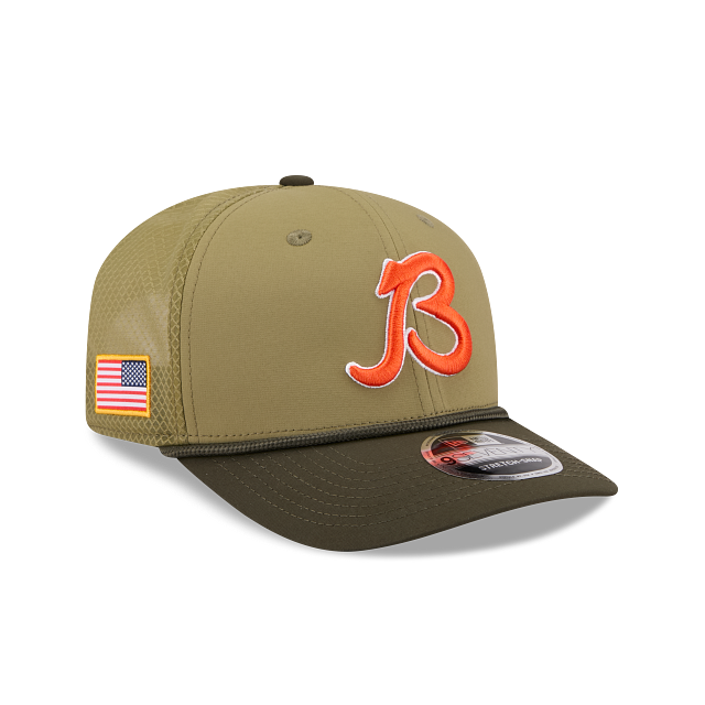 Esta gorra curva New Era 9SEVENTY Stretch Snap de Chicago Bears de la colección NFL Salute to Service 2025 presenta un diseño en color verde con el logotipo de los Bears bordado en los paneles frontales, la bandera de Estados Unidos del lado derecho, malla trucker y el logo de la NFL en la parte de atrás, el logo del equipo en el undervisor y el flag de New Era bordado del lado izquierdo. Cómprala ya.