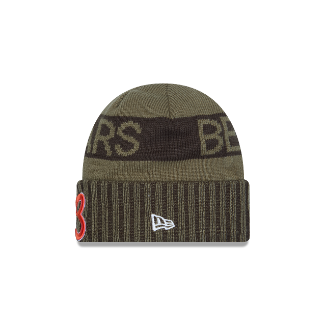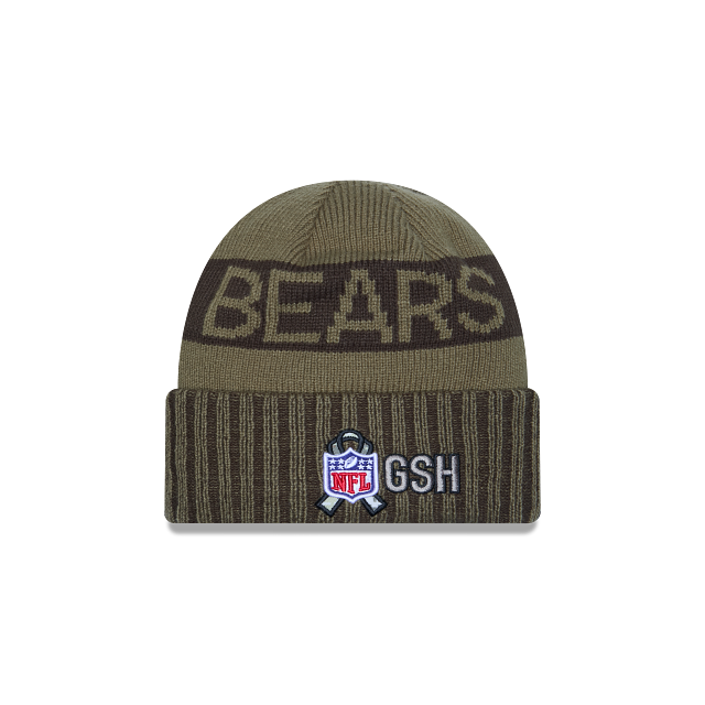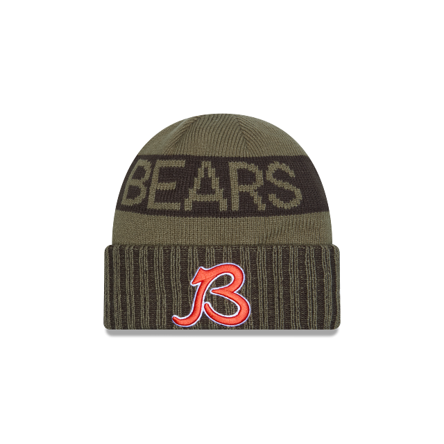 Este gorrito New Era de Chicago Bears de la colección NFL Salute to Service 2025 presenta el logotipo de los Bears bordado en la parte frontal, el nombre del equipo en la parte superior, la bandera de Estados Unidos en la parte derecha, el logo de la NFL en la parte de atrás y el flag de New Era bordado del lado izquierdo. Cómprala ya.
