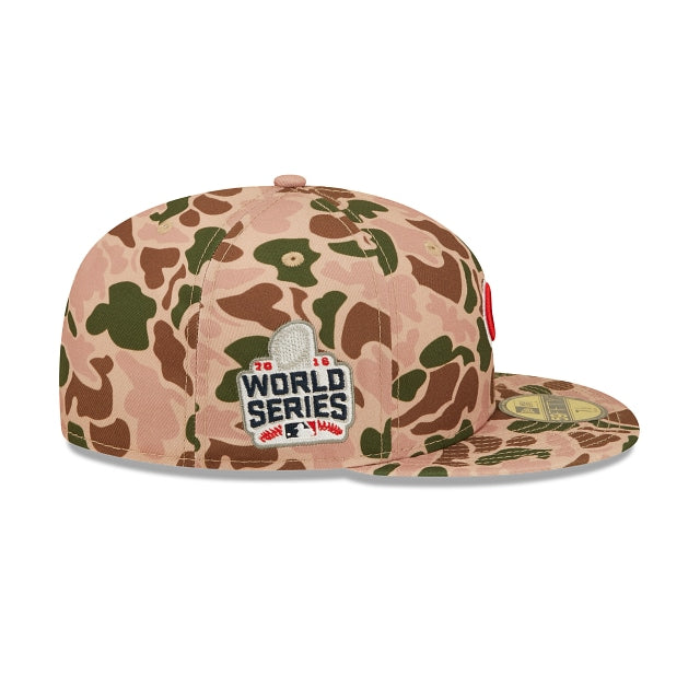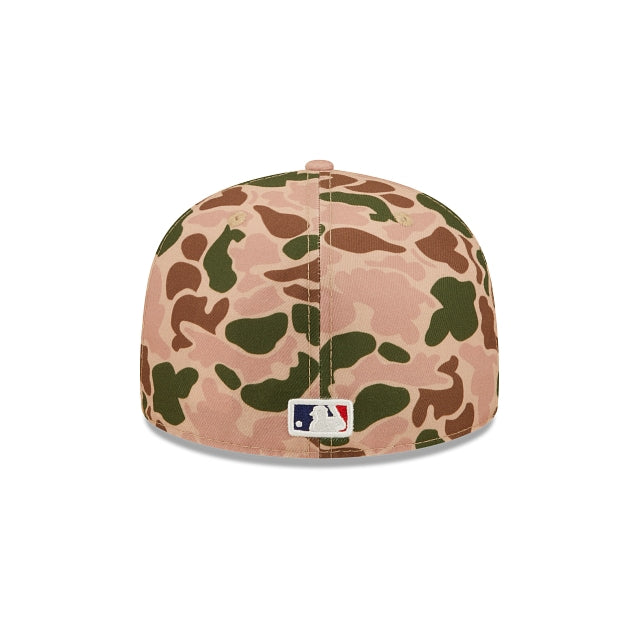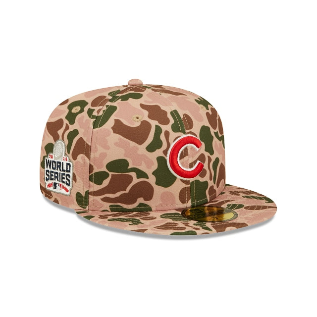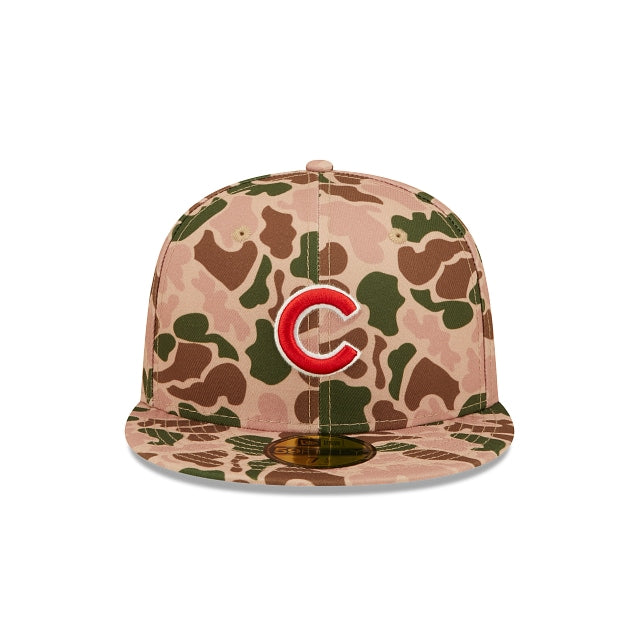 Esta gorra New Era 59FIFTY de Chicago Cubs MLB Duck Camo presenta una confección de camuflaje de pato con el logotipo de los Cubs bordado en los paneles frontales, un parche lateral de World Series bordado en el lado derecho y el logotipo de MLB Batterman en la parte trasera. Los detalles adicionales incluyen el undervisor rosa. Cómprala ya.