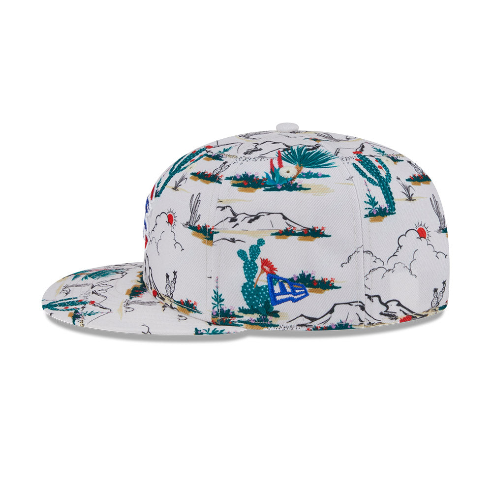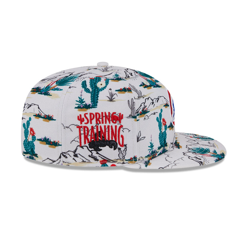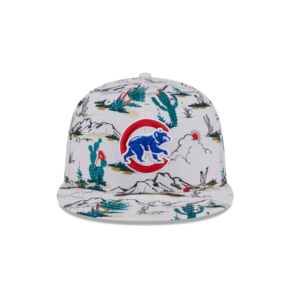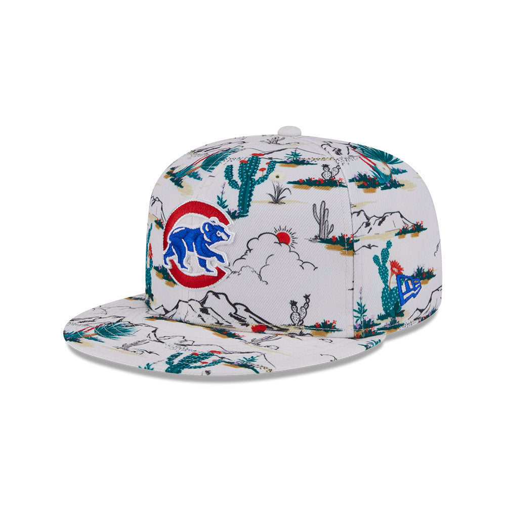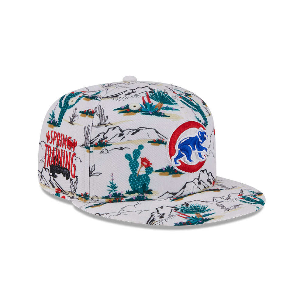 Esta gorra plana New Era 9FIFTY de Chicago Cubs de la colección MLB Spring Training Fan Pack 2025 presenta un all over print de un paisaje desértico con el logotipo de los Cubs bordado en los paneles frontales, Spring Training bordado del lado derecho y el flag de New Era bordado del lado izquierdo. Cómprala ya.