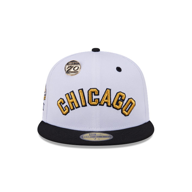 Celebra el 70 aniversario de la silueta que cambió el juego con esta gorra New Era 59FIFTY de Chicago White Sox de la colección del New Era Cap 59FIFTY Day Collection que presenta una corona blanca con el nombre de los White Sox en dorado bordado en los paneles frontales, el pin del 70 aniversario, un parche conmemorativo del lado derecho, el logo de la liga al reverso y el flag de New Era bordado en el lado izquierdo. No te pierdas este artículo de colección y cómprala ya.