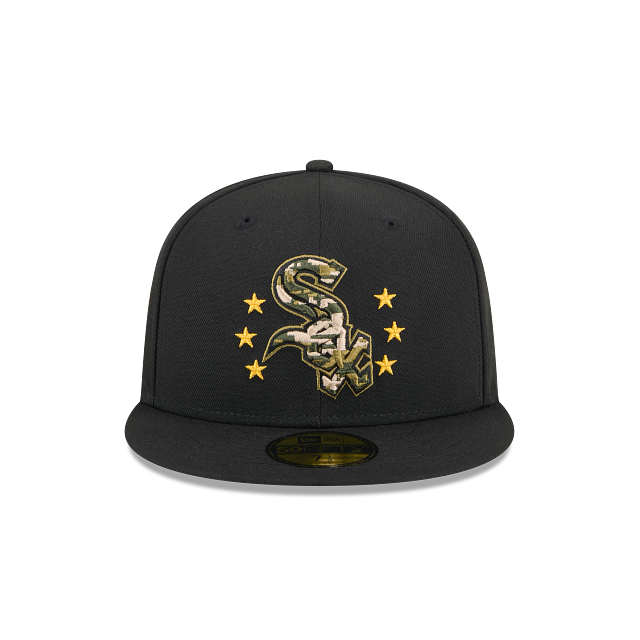 Rinde homenaje a las fuerzas armadas con esta gorra New Era 59FIFTY de Chicago White Sox de la colección MLB Armed Forces Day 2024 que presenta un diseño negro con el logotipo de los White Sox camuflajeado bordado en los paneles frontales rodeado de estrellas, un parche conmemorativo del lado derecho, undervisor verde, el MLB Batterman al reverso y el flag de New Era bordado en el lado izquierdo. Cómprala ya.