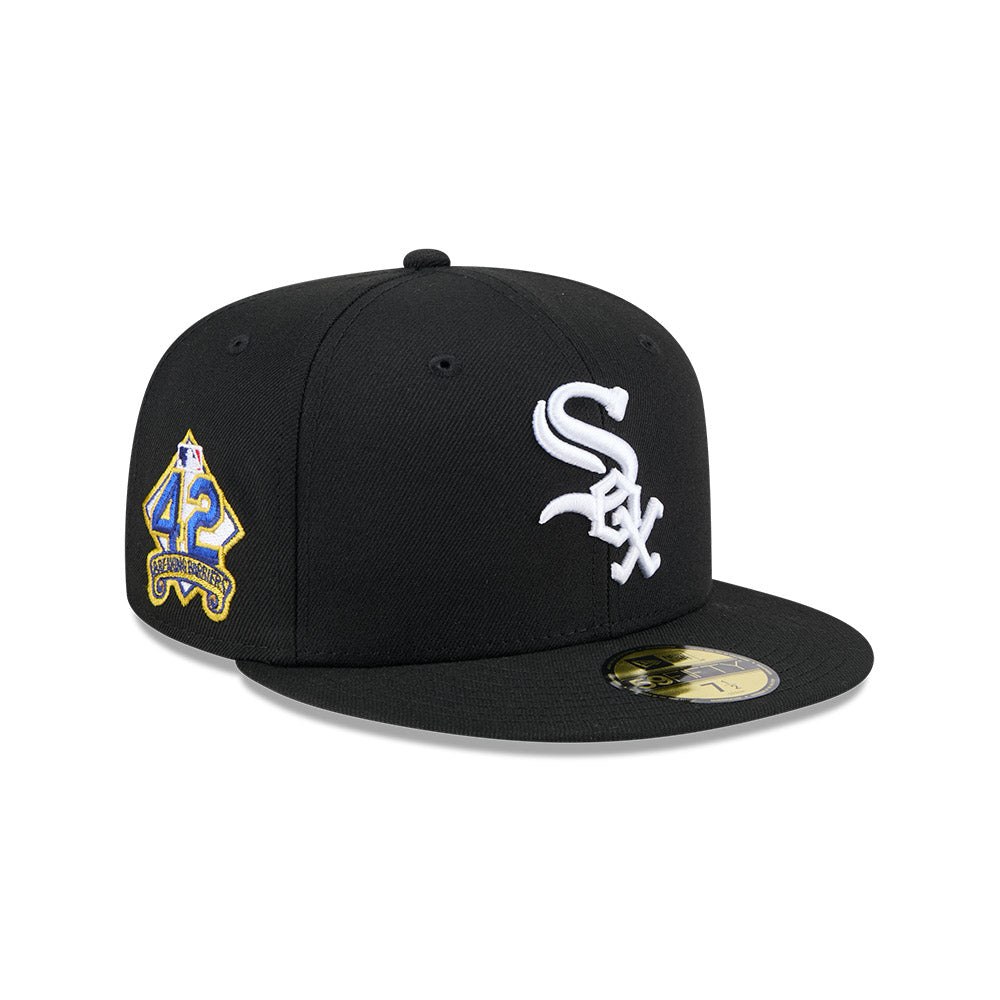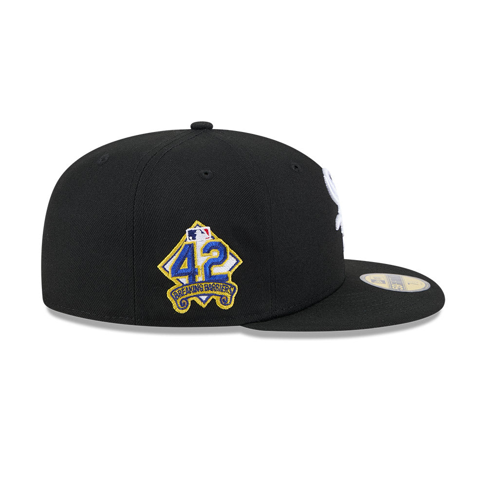 Esta gorra plana New Era 59FIFTY de Chicago White Sox de la colección MLB Jackie Robinson Day 2025 presenta el logotipo de los White Sox bordado en los paneles frontales, un parche conmemorativo Jackie Robinson Breaking Barriers del lado derecho, la firma del jugador en el undervisor, el MLB Batterman al reverso y el flag de New Era bordado del lado izquierdo. Cómprala ya.