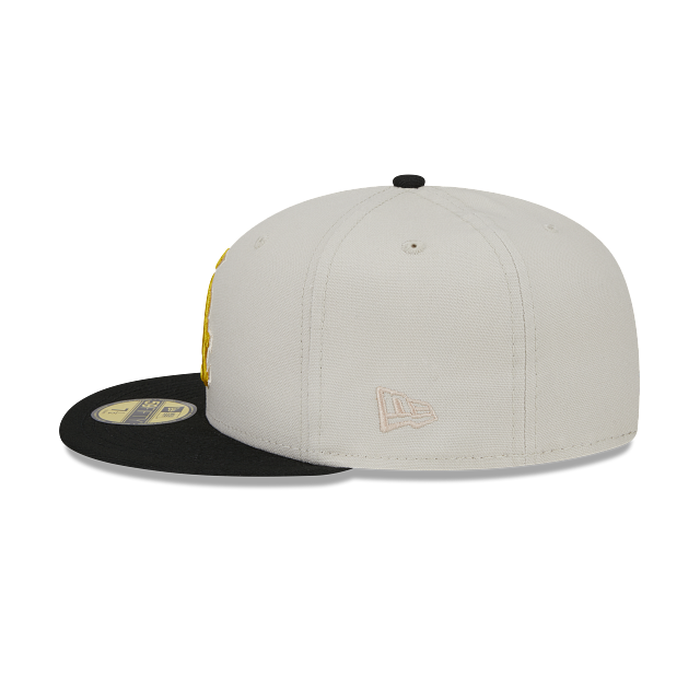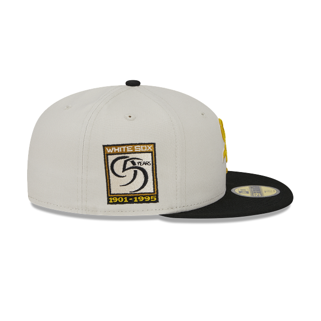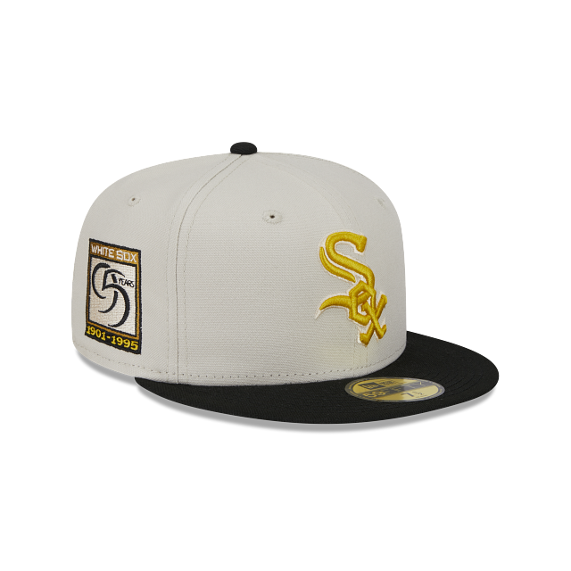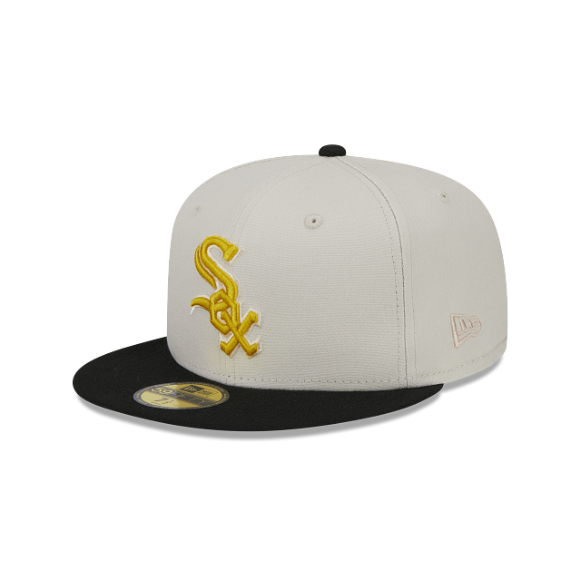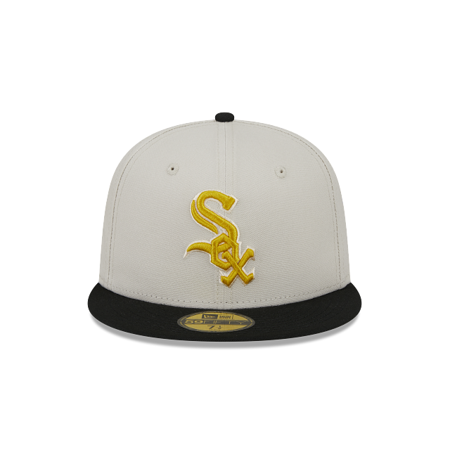 Esta gorra New Era 59FIFTY de Chicago White Sox de la colección MLB Two Tone Stone presenta una visera negra y la corona blanca con el logotipo de los White Sox dorado bordado en los paneles frontales, un parche conmemorativo del lado derecho y el flag de New Era bordado en el lado izquierdo. Eleva tu estilo y cómprala ya.