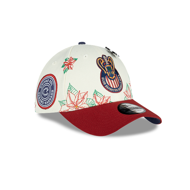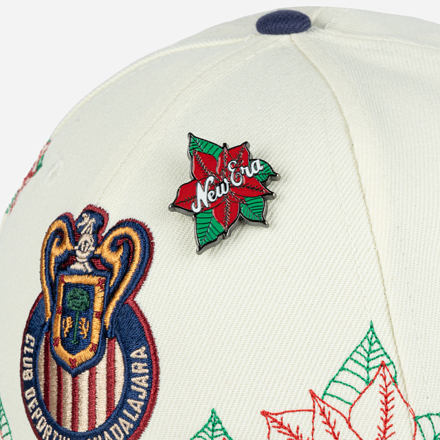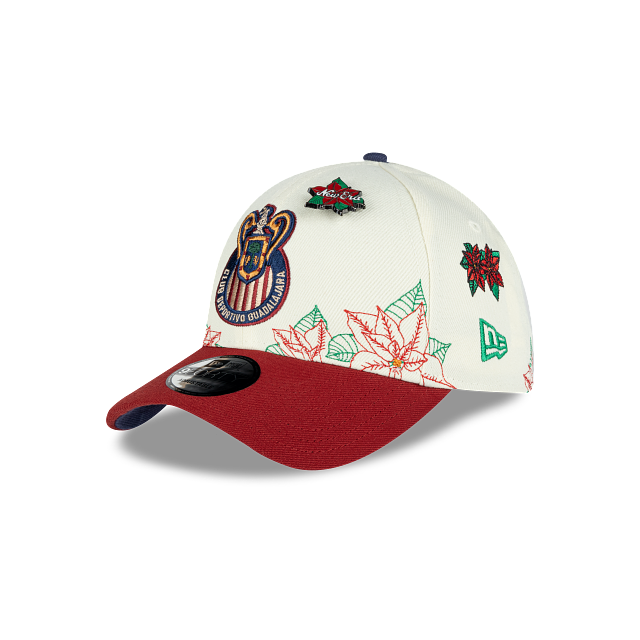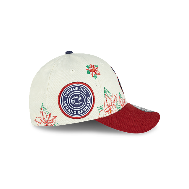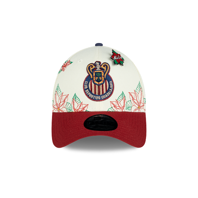 Esta gorra curva New Era 9FORTY de Chivas de la colección Futbol Mexicano Nochebuena presenta un diseño con el logotipo de las Chivas bordado en los paneles frontales junto con un pin en forma de flor de nochebuena, hojas de nochebuena en toda la corona, un parche representativo del equipo del lado derecho y el flag de New Era bordado del lado izquierdo. Cómprala ya.