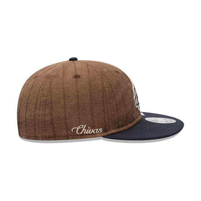 Esta gorra plana New Era 9FIFTY Retro Crown de Chivas de la colección Futbol Mexicano LMX Wool Pinstripe presenta una confección en lana con un diseño a rayas, el logotipo retro de los Chivas bordado en los paneles frontales, el nombre del equipo del lado derecho, el logo actual del equipo en la parte de atrás y el flag de New Era bordado del lado izquierdo. Cómprala ya.