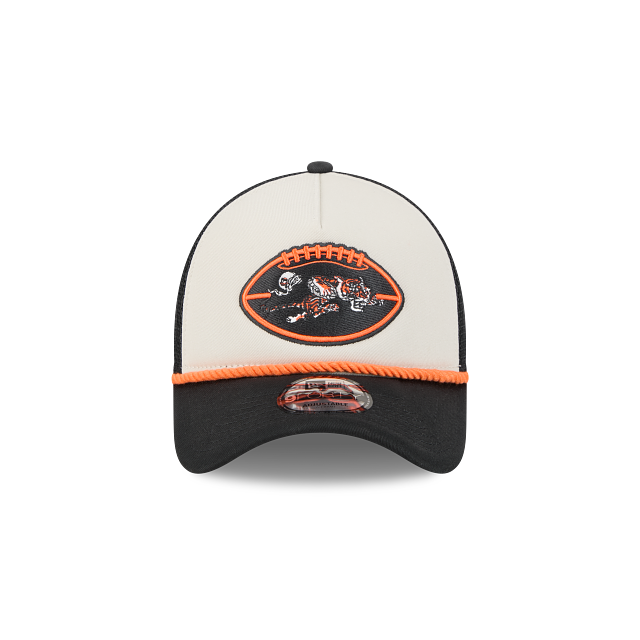 Esta gorra curva New Era 9FORTY AF de Cincinnati Bengals de la colección NFL Sideline Historic 2024 presenta un diseño con el logotipo histórico de los Bengals dentro de un balón de futbol americano bordado en los paneles frontales, una decoración de cuerda trenzada en el visor, malla trucker y el logo de la NFL al reverso y el flag de New Era bordado del lado izquierdo. Apoya a tu equipo y cómprala ya.