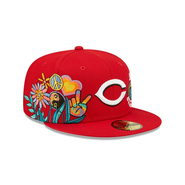 Esta 59FIFTY de Cincinnati Reds de la colección Groovy presenta el logotipo de los Reds bordado en los paneles frontales a juego con un parche de World Series Champions y un diseño de peace and love floral en el lado derecho. Detalles adicionales incluyen undervisor azul. Cómprala ya.