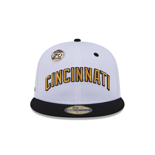 Celebra el 70 aniversario de la silueta que cambió el juego con esta gorra New Era 59FIFTY de Cincinnati Reds de la colección del New Era Cap 59FIFTY Day Collection que presenta una corona blanca con el nombre de los Reds en dorado bordado en los paneles frontales, el pin del 70 aniversario, un parche conmemorativo del lado derecho, el logo de la liga al reverso y el flag de New Era bordado en el lado izquierdo. No te pierdas este artículo de colección y cómprala ya.