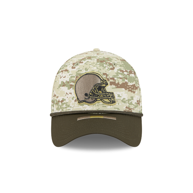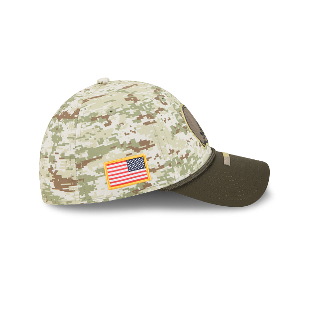 Esta gorra curva New Era 39THIRTY de Cleveland Browns de la colección NFL Salute to Service 2025 presenta un diseño de camuflaje con el logotipo de los Browns bordado en los paneles frontales, la bandera de Estados Unidos del lado derecho, el logo de la NFL en la parte de atrás, el logo del equipo en el undervisor y el flag de New Era bordado del lado izquierdo. Cómprala ya.