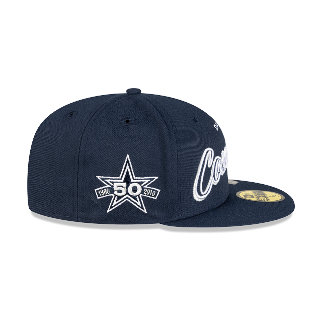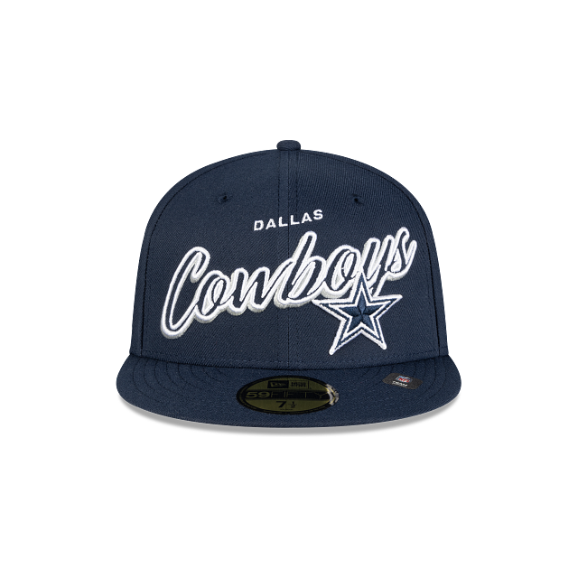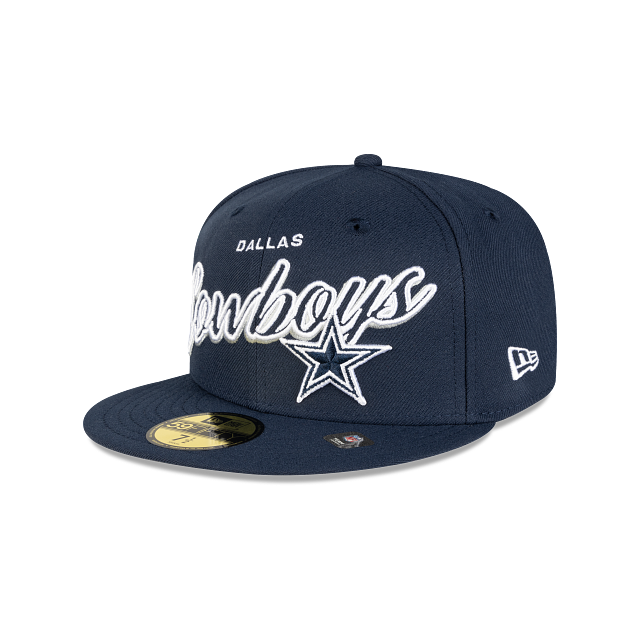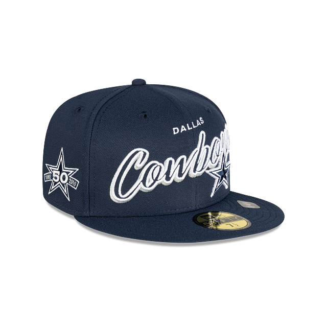 Esta gorra plana New Era 59FIFTY de Dallas Cowboys de la colección NFL Script Sided presenta un diseño con el nombre y logotipo de los Cowboys bordados en los paneles frontales, un parche conmemorativo del lado derecho, el logo de la liga al reverso y el flag de New Era bordado del lado izquierdo. Luce con estilo y cómprala ya.