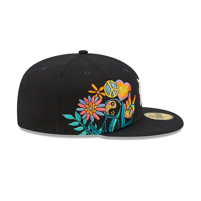 Esta 59FIFTY de Detroit Tigers de la colección Groovy presenta el logotipo de los Tigers bordado en los paneles frontales a juego con un parche de World Series Champions y un diseño de peace and love floral en el lado derecho. Detalles adicionales incluyen undervisor azul. Cómprala ya.