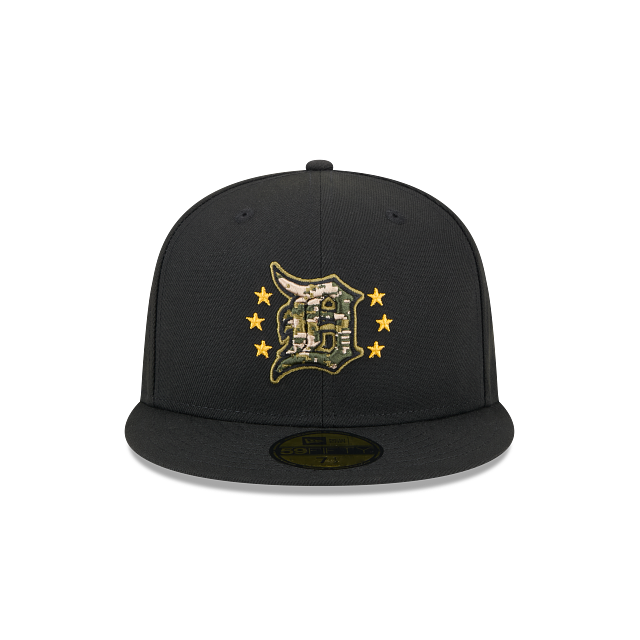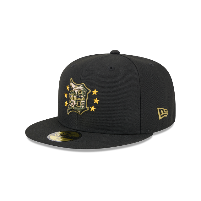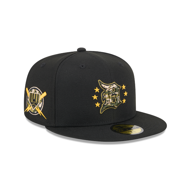 Rinde homenaje a las fuerzas armadas con esta gorra New Era 59FIFTY de Detroit Tigers de la colección MLB Armed Forces Day 2024 que presenta un diseño negro con el logotipo de los Tigers camuflajeado bordado en los paneles frontales rodeado de estrellas, un parche conmemorativo del lado derecho, undervisor verde, el MLB Batterman al reverso y el flag de New Era bordado en el lado izquierdo. Cómprala ya.