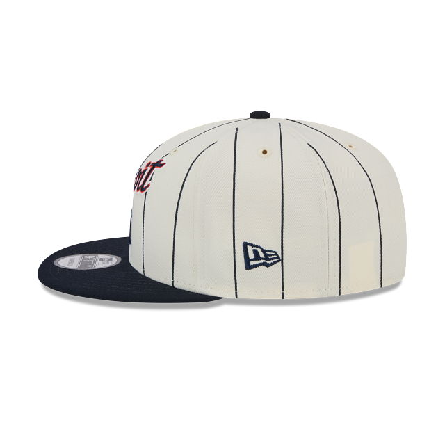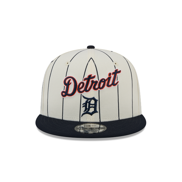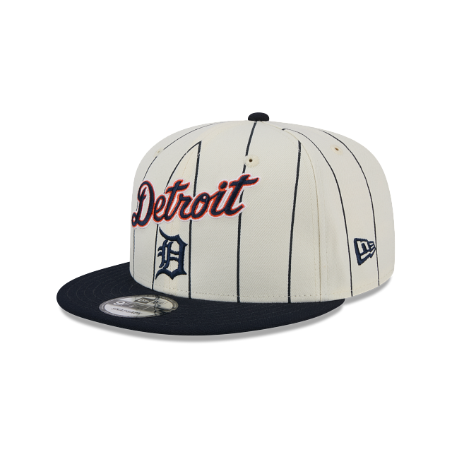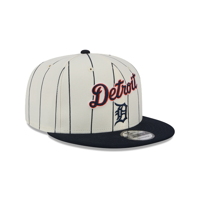 Esta gorra New Era 9FIFTY de Detroit Tigers de la colección exclusiva de la tienda en línea MLB Jersey Pinstripe presenta un diseño blanco con líneas verticales estilo jersey pinstripe con el logotipo retro y el nombre de los Tigers bordado en los paneles frontales, undervisor verde y el flag de New Era bordado en el lado izquierdo. Luce con estilo y cómprala ya.