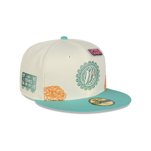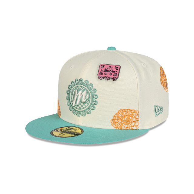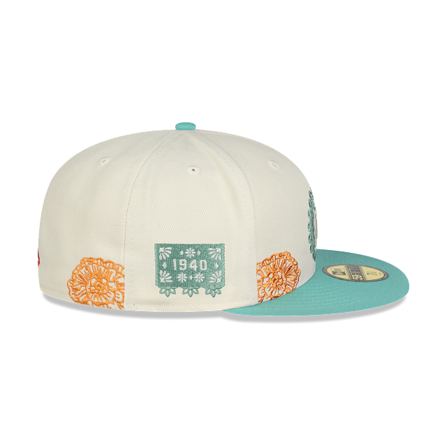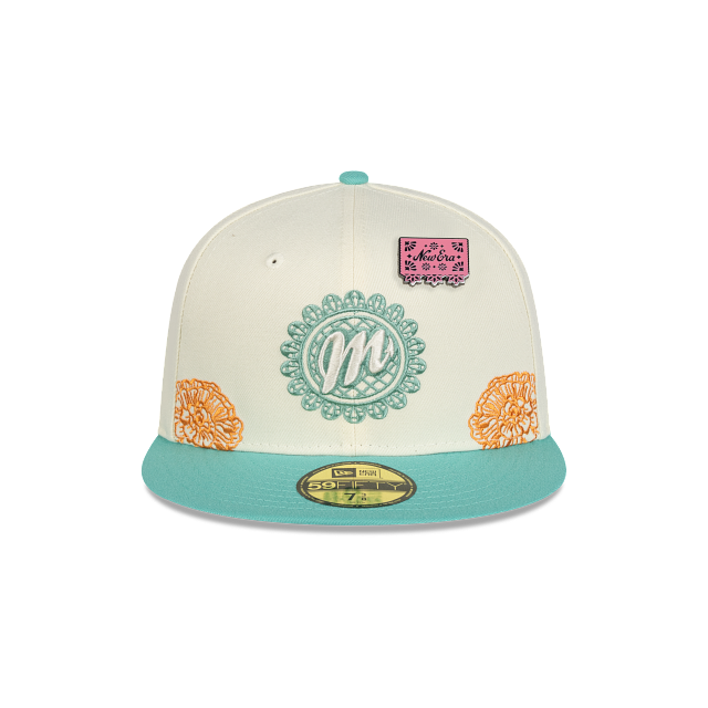 Esta gorra plana New Era 59FIFTY de Diablos Rojos del México de la colección LMB Día de Muertos presenta un diseño inspirado en la artesanía del papel picado con el logotipo de los Diablos bordado en los paneles frontales, detalles de flores de cempasúchil en la corona, el nombre del equipo al reverso, un pin en forma de papel picado y el flag de New Era bordado del lado izquierdo. Cómprala ya.