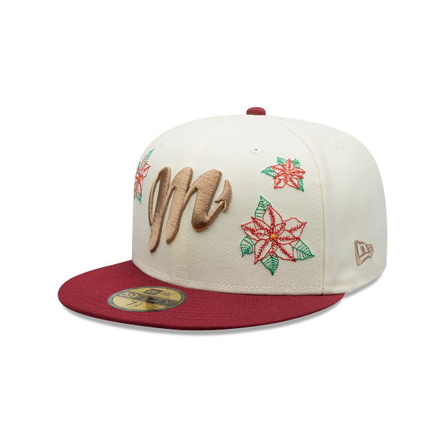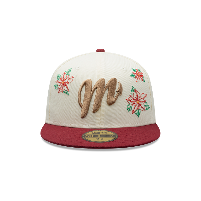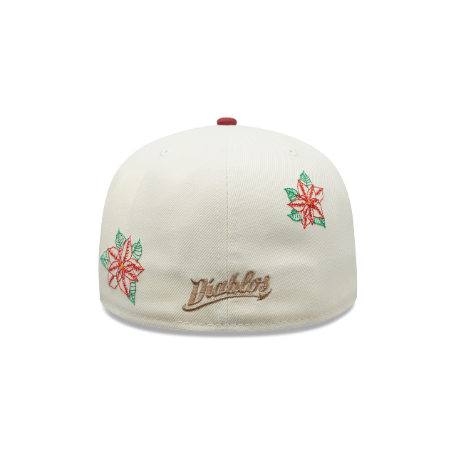 Esta gorra plana New Era 59FIFTY de Diablos Rojos del México de la colección LMB Nochebuena presenta un diseño con flores de nochebuena bordadas en la corona, el logotipo de los Diablos bordado en los paneles frontales, el nombre del equipo en la parte de atrás y el flag de New Era bordado del lado izquierdo. Cómprala ya.