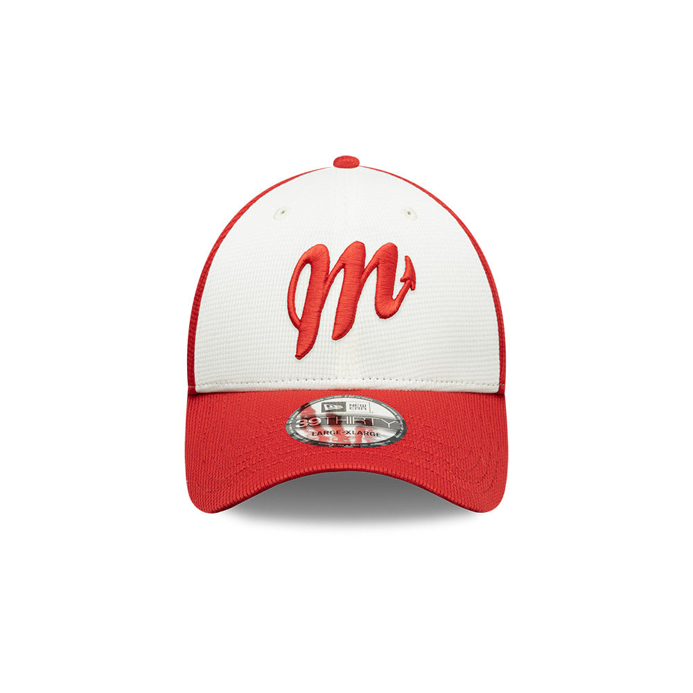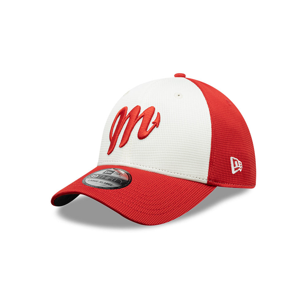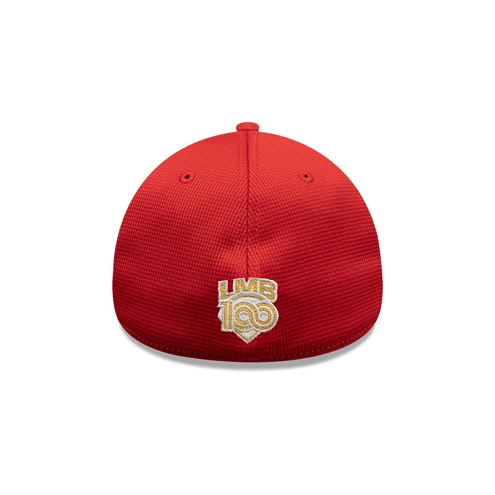 Esta gorra curva New Era 39THIRTY de Diablos Rojos del México de la colección LMB Spring Training 2025 presenta el logotipo de los Diablos bordado en los paneles frontales, el logo de la LMB 100 Años al reverso y el flag de New Era bordado del lado izquierdo. Cómprala ya.