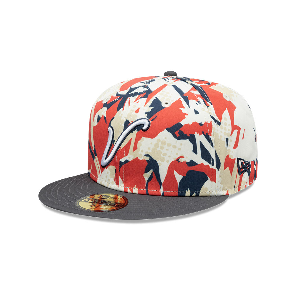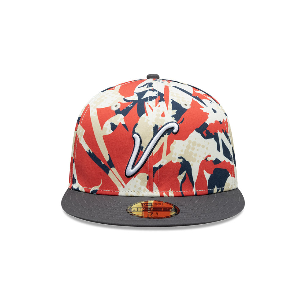 Esta gorra plana New Era 59FIFTY de El Águila de Veracruz de la colección LMB Spring Training Fan Pack 2025 presenta un estampado multicolor en la corona con el logotipo de El Águila bordado en los paneles frontales, el logo de la LMB 100 Años al reverso al reverso y el flag de New Era bordado del lado izquierdo. Apoya a tu equipo y cómprala ya.