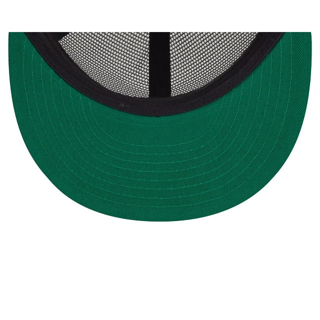 Esta gorra Fear of God Essentials Full Mesh 59FIFTY presenta un logotipo de Fear of God bordado en los paneles frontales, undervisor Kelly Green y el logotipo oficial de MLB Batterman en la parte trasera. Cómprala ya.