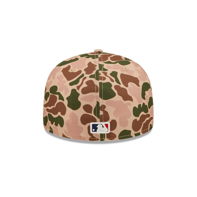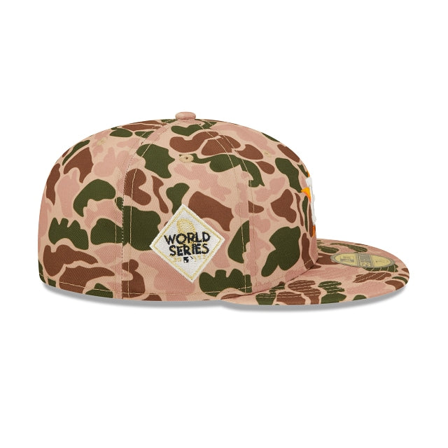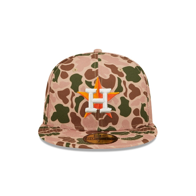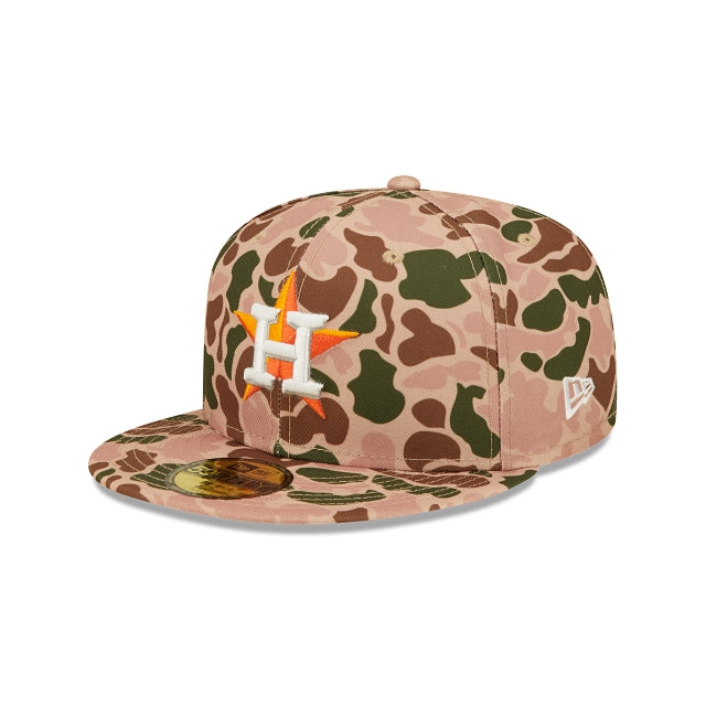 Esta gorra New Era 59FIFTY de Houston Astros MLB Duck Camo presenta una confección de camuflaje de pato con el logotipo de los Astros bordado en los paneles frontales, un parche lateral de World Series bordado en el lado derecho y el logotipo de MLB Batterman en la parte trasera. Los detalles adicionales incluyen el undervisor rosa. Cómprala ya.